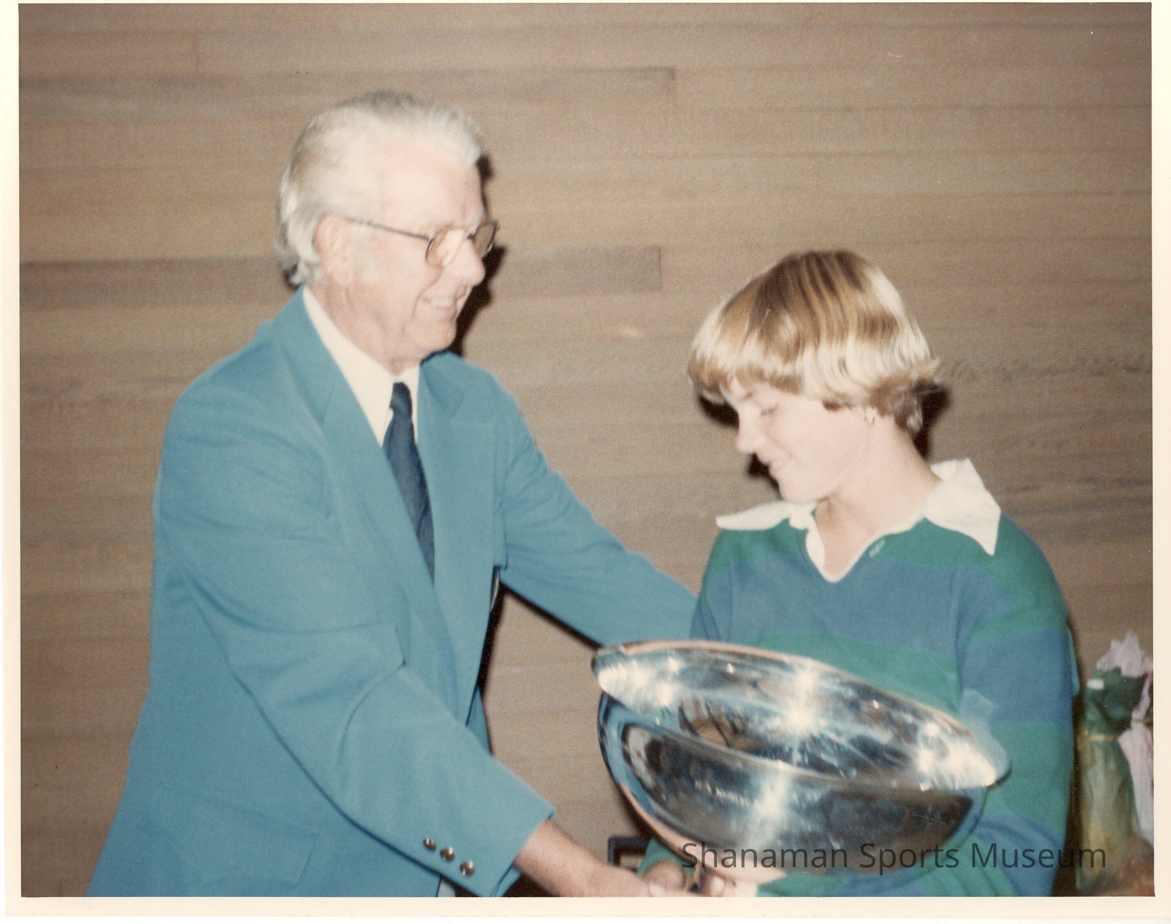 Original color print of Bill Jepsen presenting the TAC perpetual trophy to Patty Curtiss, winner of 2nd annual Tac. Women's Am. Golf tourn.Lexicon