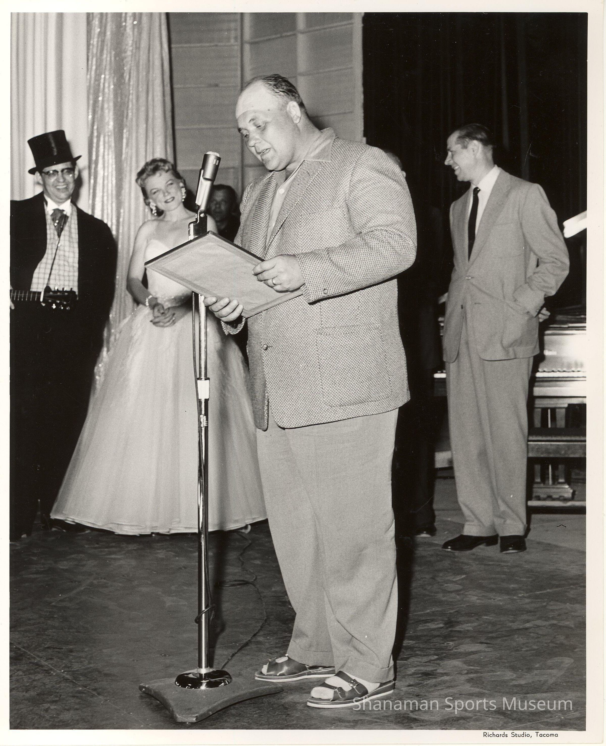 B/W original print of Bert Thomas standing on stage reading a plaque at a microphone. Harold Tollefson stands to the back right.