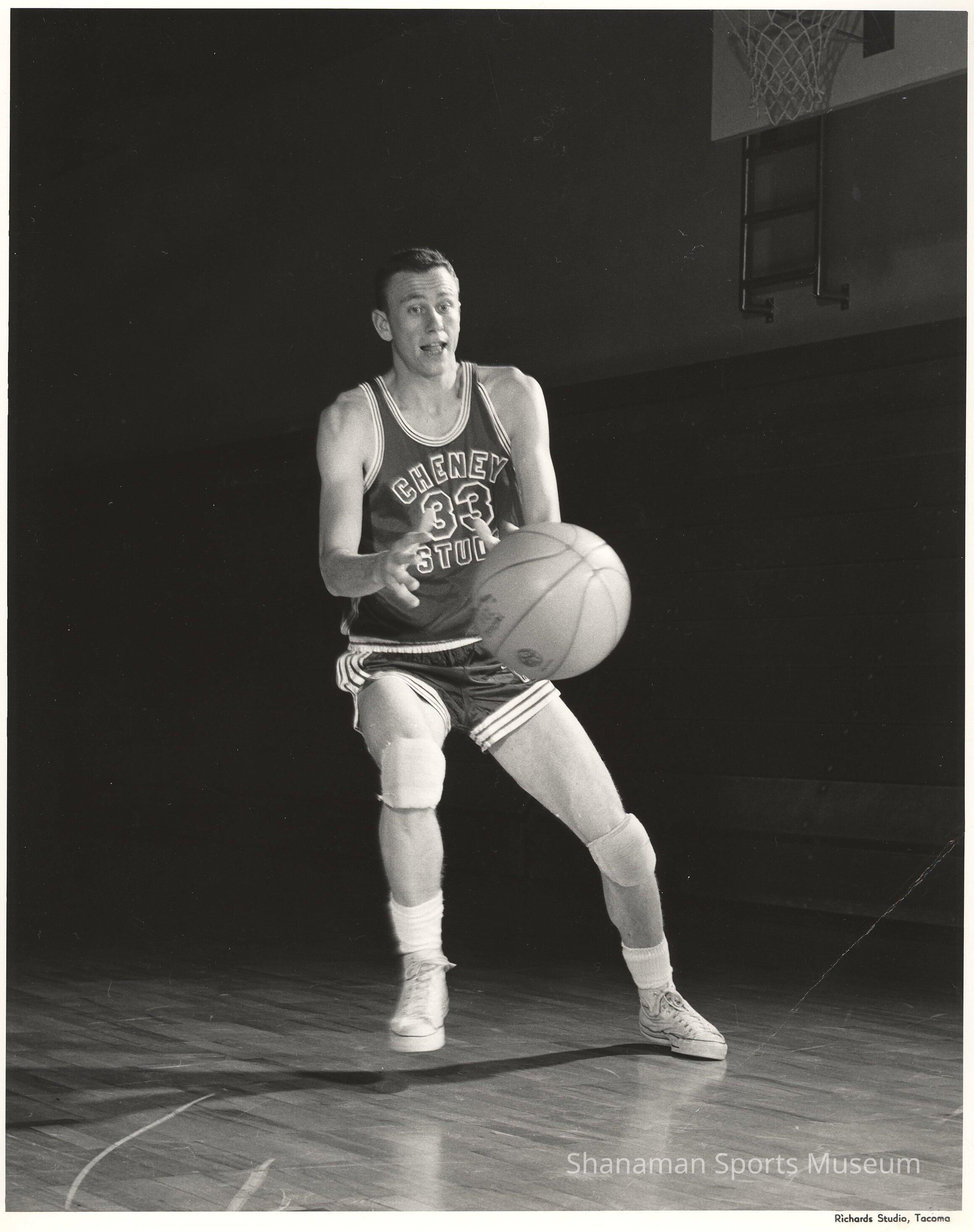 Cheney Studs #33 Jim Van Beek catches a basketball. Coached by Marv Harshman at Pacific Lutheran University, Jim Van Beek, along with Chuck Curtis and Roger Iverson were known as “The Three Basketeers,” and led the Lutes to the NAIA Tournament three years running and nearly won it in 1959. Pictured here playing for the Cheney Studs, Van Beek went on to a long and successful amateur career after his collegiate career ended, including leading the Studs to the Northwest AAU League title at a time when the games drew large crowds to Seattle Pacific University, PLU and the University of Puget Sound. The league was full of former collegiate stars from the Northwest and featured aggressive competition nightly. Van Beek and the Studs won the 1963 Washington State Amateur Tournament before disbanding. Van Beek was inducted into the PLU Hall of Fame in 1991, among the second class of inductees. Photo by Richards Studio of Tacoma.