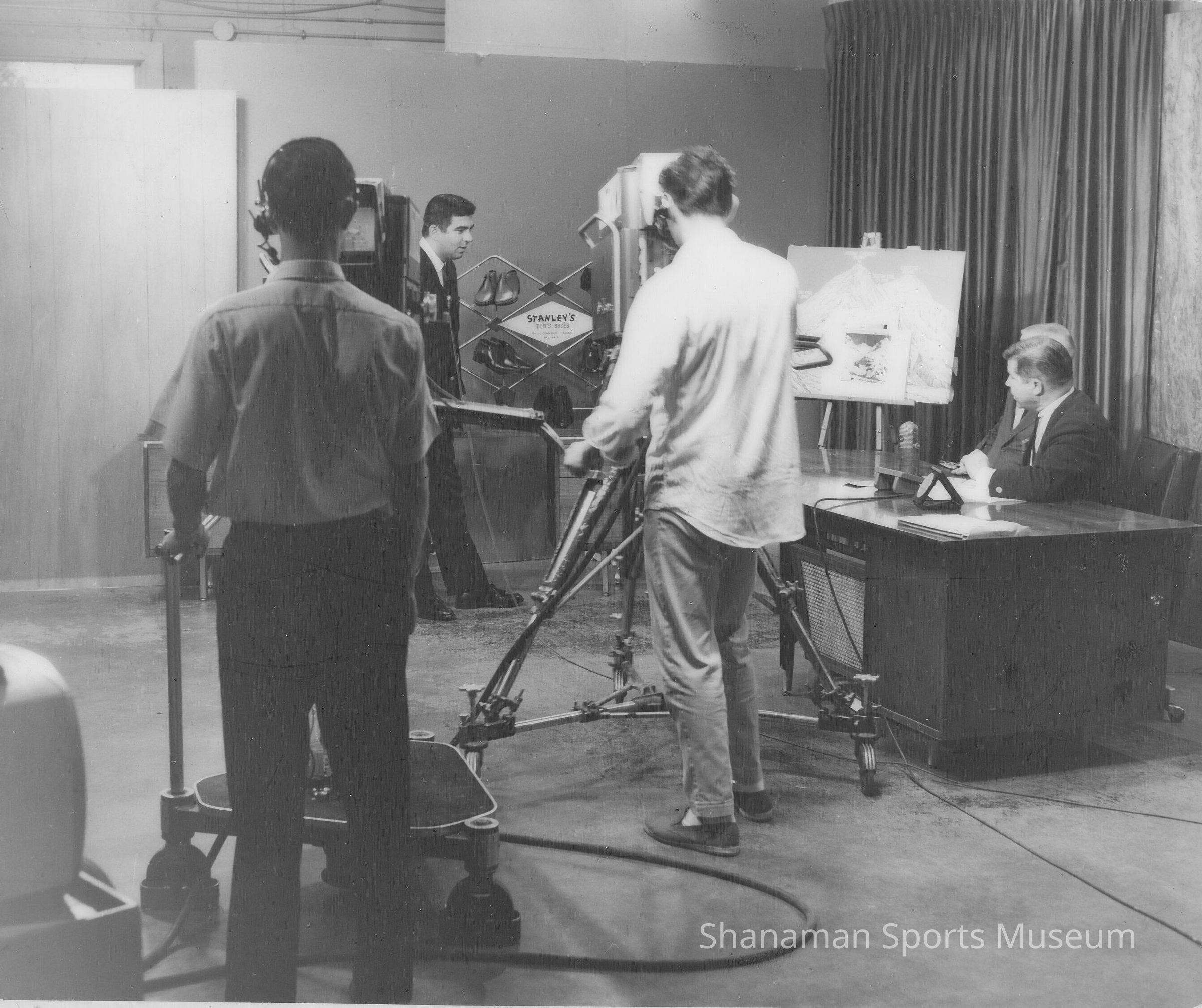 Two cameramen film Joe Macaluso, who was director of Tacoma Athletic Commission, in front of a Stanley's men's shoes display at KTVW-TV's studio in Tacoma.