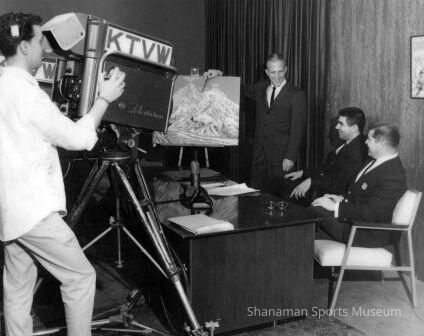 An unidentified man, center, points at a map of Mount Everest to Tacoma Athletic Commission director Joe Macaluso, second from right, and an unidentified man during a broadcast on KTVW-TV Channel 13.