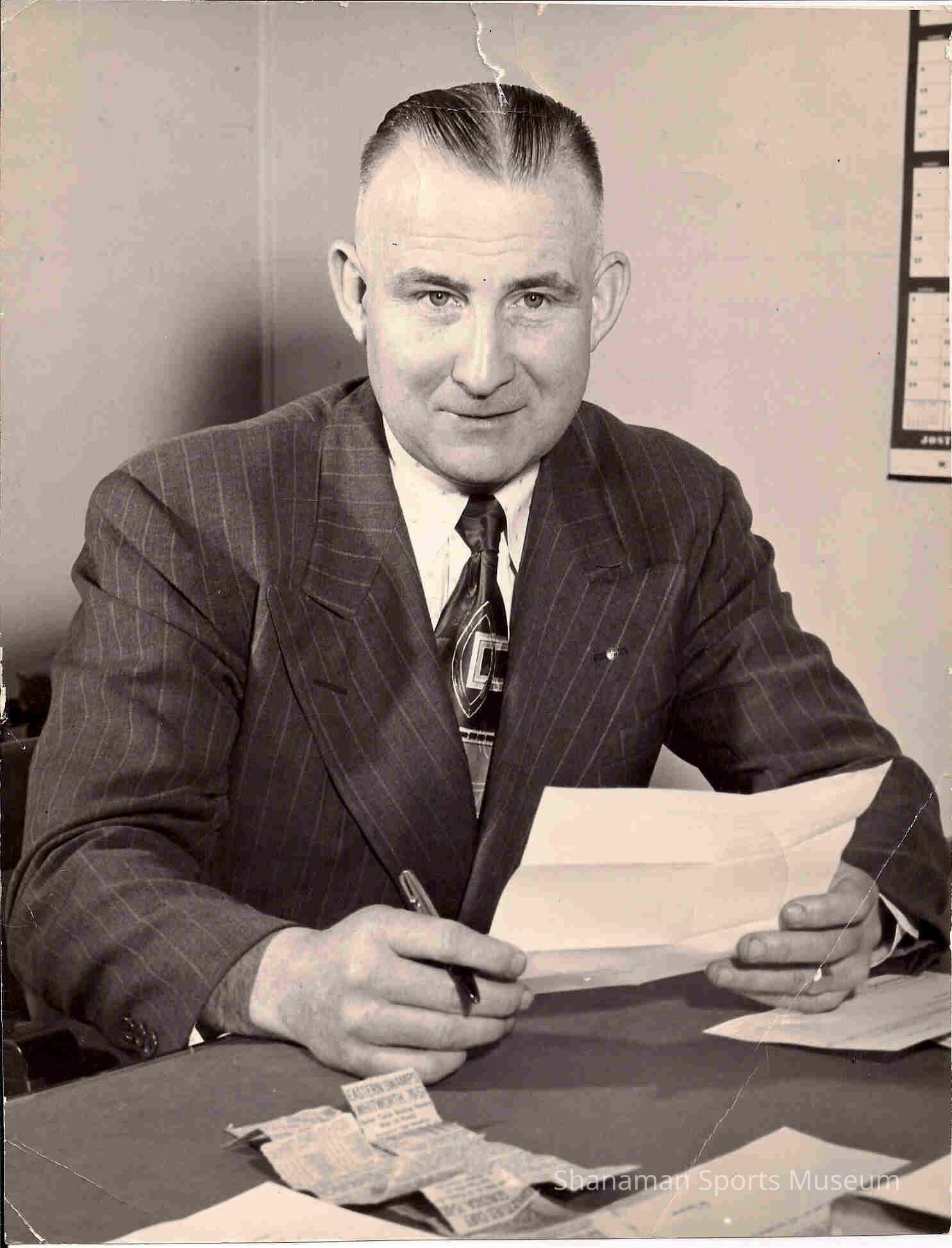 A black and white photograph of legendary coach John Heinrick in a striped suit and sitting at a desk. He is known as one of the all-time great coaches in Tacoma history having managed several baseball teams to come from the area. Heinrick coached the 1934 Pacific Match team and the Johnson Paint team that played in the 1937 National Baseball Congress tournament; this was the first time a Tacoma based team traveled beyond the West Coast to participate in a national tournament. Heinrick had an extensive career in the area coaching the semipro Tacoma Tigers, serving as president of the City League, served as athletic director at Stadium High School as well as spent time as a coach and athletic director at the University of Puget Sound.Lexicon