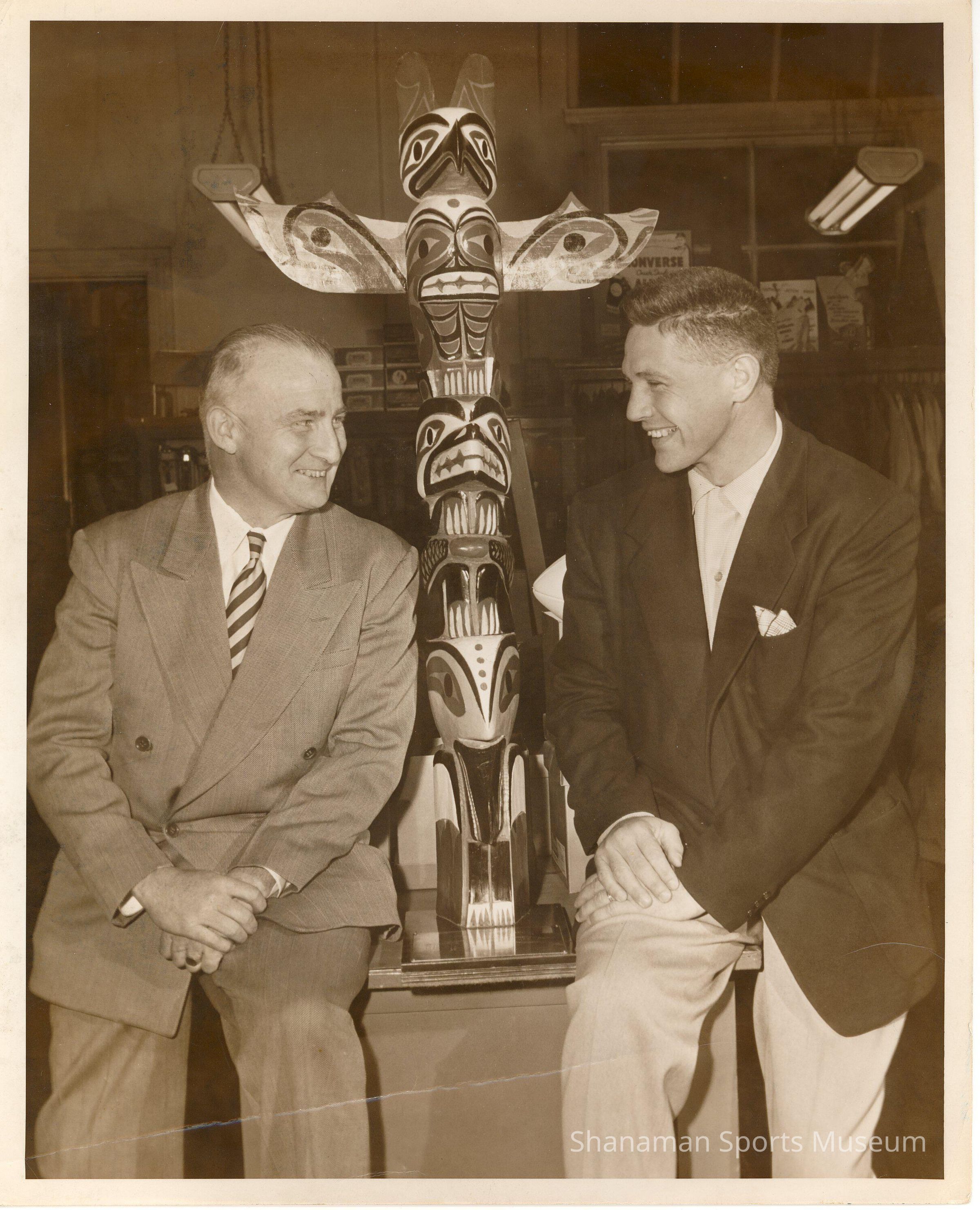 Original print, John Heinrick and Marv Harshman sitting on the edge of a table. Large table-top totem pole between them. Share LaughRelationships