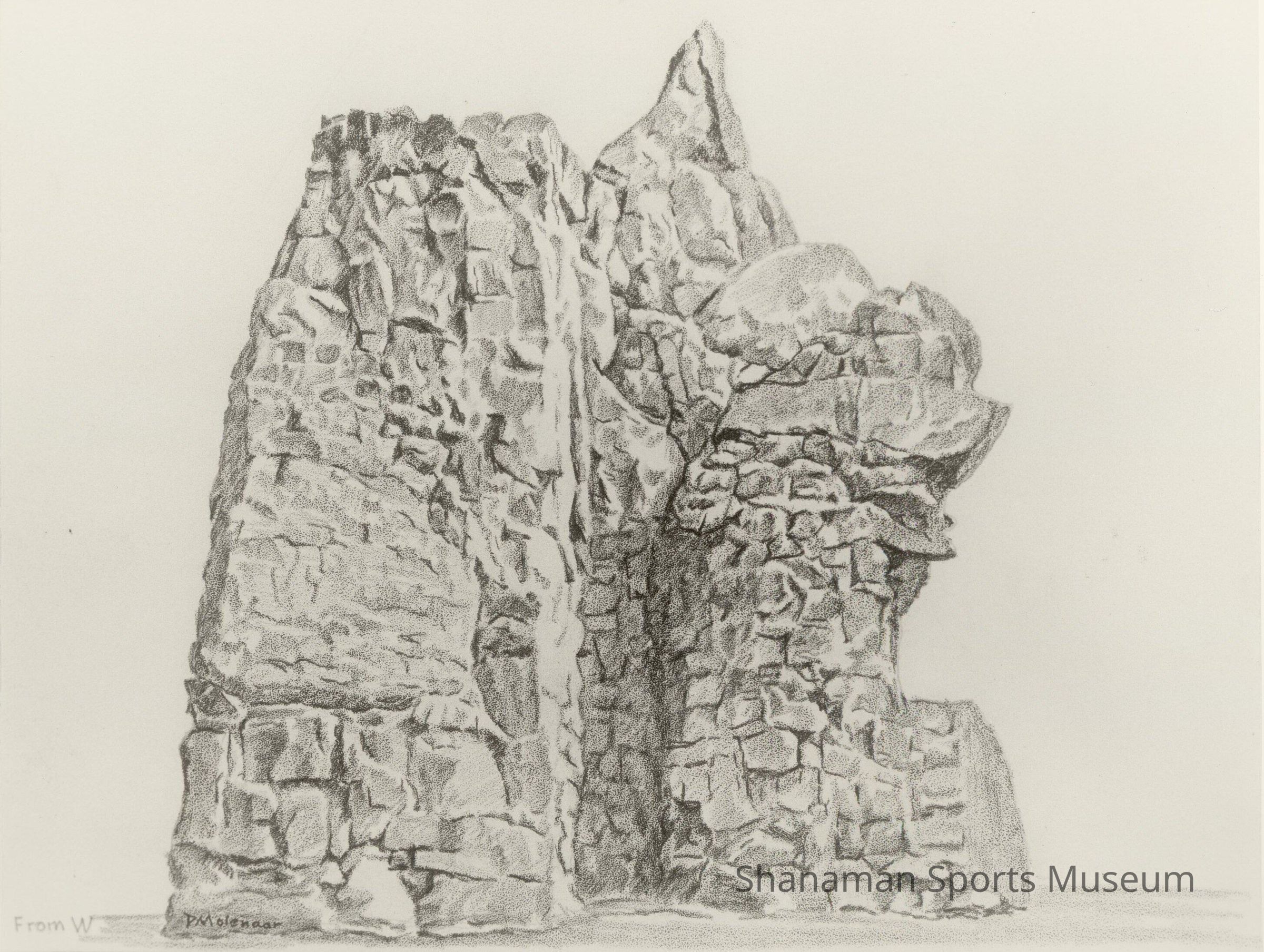 A sketch of SPIRE Rock by accomplished mountaineer, cartographer and artist Dee Molenaar. The Spanaway Ice and Rock Education outdoor climbing facility opened at Sprinker Recreation Center in 1976 and was built entirely by volunteers. Wayne Cooke served as the chairperson for the committee that spearheaded the project. Climbers designed SPIRE Rock as a place to hone their skills. Thousands of volunteer hours were needed to finish the project and to maintain it over the years. SPIRE Rock cost $4,016, according to Pierce County Parks and Recreation, a fraction of what it would have cost had the work been contracted out.Lexicon