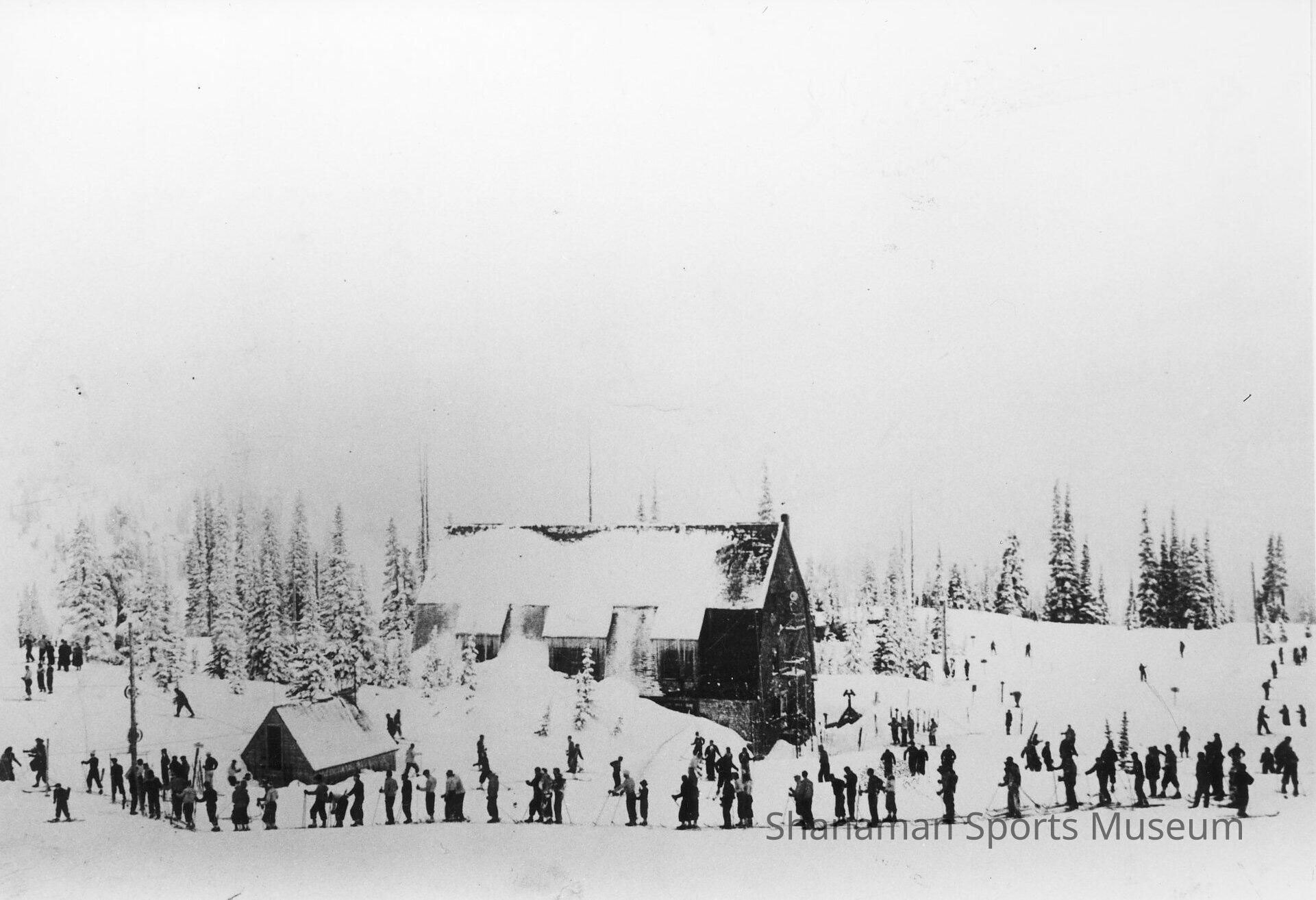 Skiers line up at Paradise waiting for their turn to ride a lift up the slopes. Tacoma’s Jim Parker and Chauncy Griggs installed the first rope tow at Paradise in 1937. The 1,000-foot lift hauled about 250 skiers per hour up 300 feet. Skiers paid 10 cents per ride or $1 for the day. The temporary lifts were removed each spring, but the park eventually stopped allowing the lifts in an effort to preserve the natural setting. Today only two national parks - Yosemite and Olympic - still offer lift-serviced skiing.Made/Created