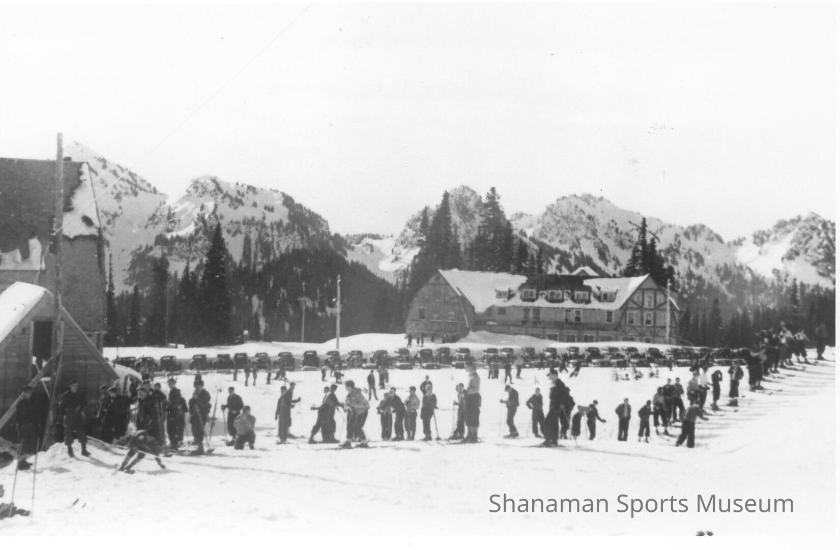 With the lodge and Tatoosh Range serving as a panoramic backdrop, skiers wait their turn to ride a rope tow up the slopes at Paradise in Mount Rainier National Park. Tacoma’s Jim Parker and Chauncy Griggs installed the first rope tow at Paradise in 1937. While the park no longer allows the temporary lifts, hundreds of people still ski the slopes each winter weekend. There aren't many rope tows left in Washington state, but skiers can still find them at Hurricane Ridge in Olympic National Park and Meaney Lodge near Stampede Pass.Made/Created