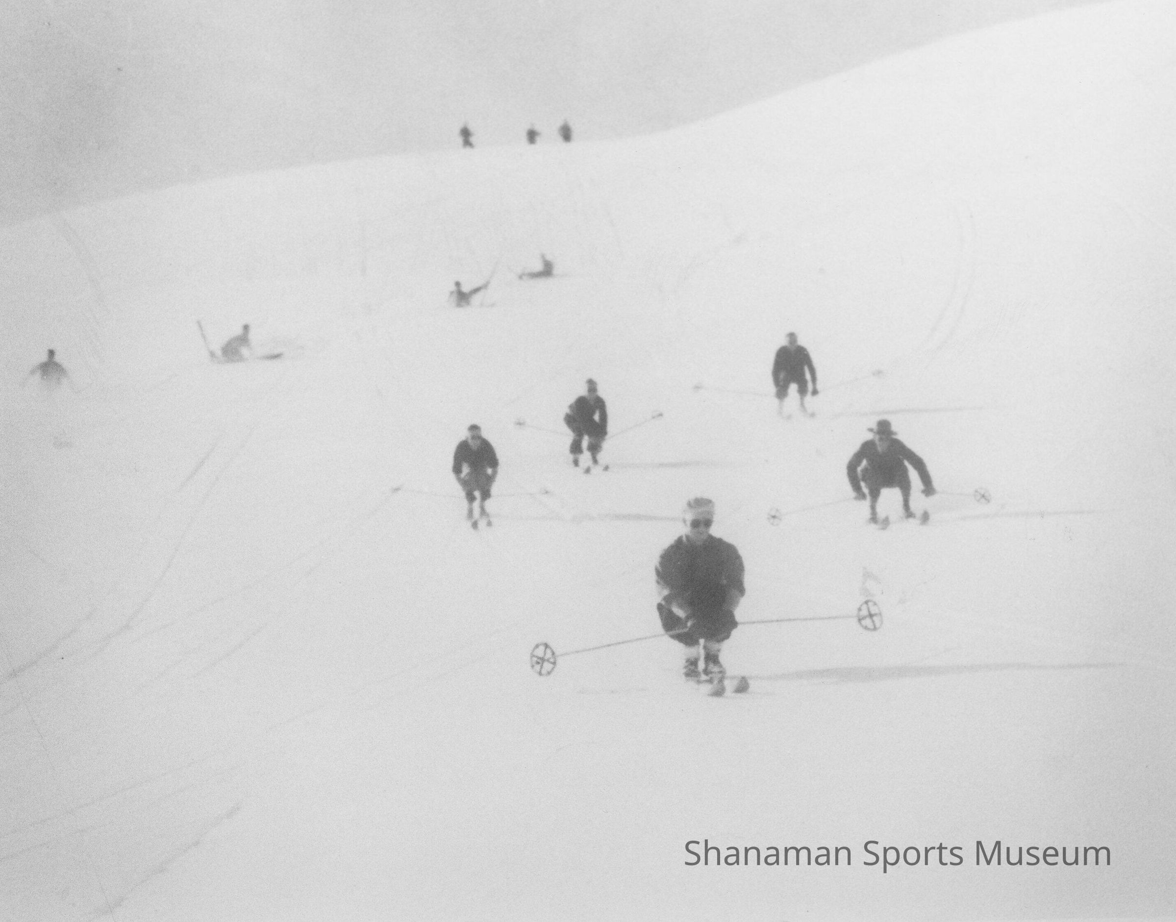 Skiers compete in a race as they ski down the slopes on Mount Rainier in this black-and-white photo taken on April 22, 1934. They were competing in the Silver Skis Race and Don Fraser won. The skiers in this black-and-white photo are identified as (from left to right) Wiegel, Tom Heard, J. Collins, an unidentified skier, and Carl Tiege. They were skiing down the Alta Vista slope, which is just above Paradise. The Silver Skis race began at Camp Muir at 10,000 feet and finished at Paradise at 5,400 feet. Skiers would reach speeds of 60 miles an hour.