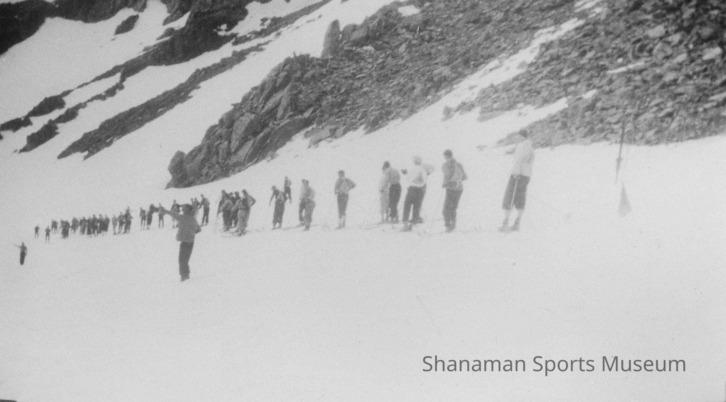 A group of skiers prepare for the start of the Silver Skis Race in this black-and-white photo taken on Mount Rainier on April 22, 1934. About 60 skiers would race from Camp Muir at 10,000 feet to Paradise at 5,400 feet. Don Fraser, reaching speeds of 60 miles an hour, won the first Silver Skis race that was 3.6 miles with a time of 10 minutes and 49 seconds. Only 44 of the 60 skiers who started the race finished. The final race was held in 1948.Lexicon