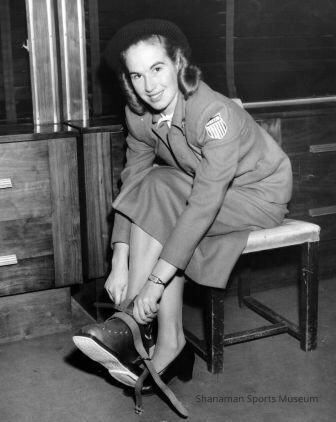 Gretchen Kunigk Fraser of Tacoma wears the official 1948 U.S. Winter Olympics uniform while changing her boots in this original 1948 photograph. It was during those Olympic Games in St. Moritz, Switzerland, that Gretchen became the first American to earn an Olympic gold medal, winning the women's slalom. She took the silver medal that year in the women's combined event. Gretchen Fraser was born in 1919 to parents who were German and Norwegian immigrants. Her mother taught her to ski at age 13 and she excelled under the tutelage of Otto Lang, later competing on the University of Puget Sound ski team. She met 1936 Olympian Donald Fraser in 1938 and the two married the following year. Both Frasers were members of the U.S. Olympic team in 1940, when the Games were cancelled due to World War II. Following her Olympic victory, Kunigk Fraser retired from competitive skiing but continued volunteer efforts with disabled skiers. She was inducted into the National Ski Hall of Fame in 1960, the same year she was tabbed for the State of Washington Sports Hall of Fame, and is also a member of the University of Puget Sound Hall of Fame. She died at age 75 in February of 1994, one month after Donald, her husband of 54 years, had passed away.Lexicon
