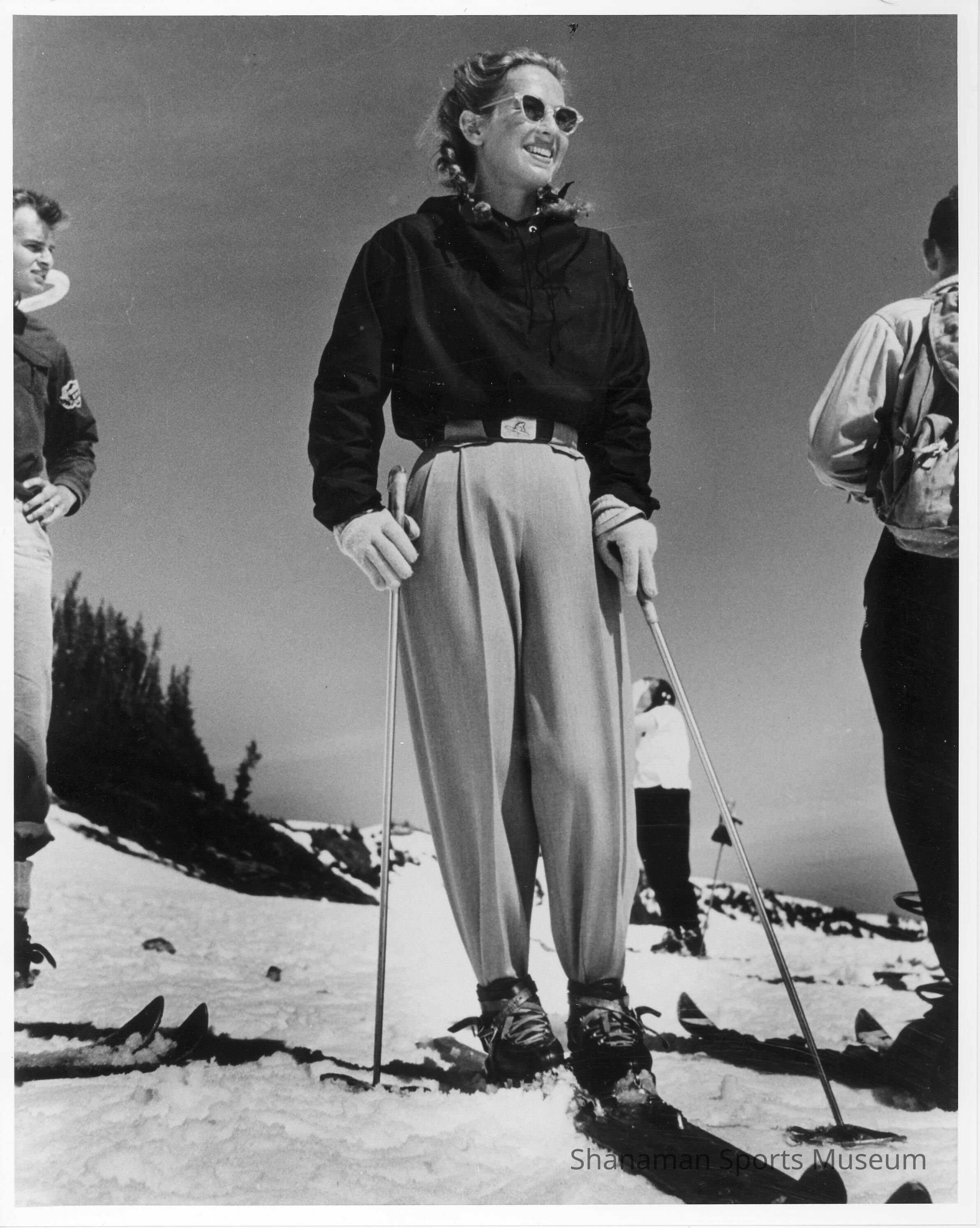 Gretchen Kunigk Fraser of Tacoma styles on the slopes wearing a dark sweater, light colored ski pants (belted and tucked into her boots), gloves and sunglasses -- plus her signature braids -- in this photo that appears to have been taken early in her career. Gretchen was the first American to win an Olympic gold medal in skiing, finishing first in the women's slalom in the 1948 Winter Olympics in St. Moritz, Switzerland. She took the silver medal that year in the women's combined event. Gretchen Fraser was born in 1919 to parents who were German and Norwegian immigrants. Her mother taught her to ski at age 13 and she excelled under the tutelage of Otto Lang, later competing on the University of Puget Sound ski team. She met 1936 Olympian Donald Fraser in 1938 and the two married the following year. Both Frasers were members of the U.S. Olympic team in 1940, when the Games were cancelled due to World War II. Following her Olympic victory, Kunigk Fraser retired from competitive skiing but continued volunteer efforts with disabled skiers. She was inducted into the National Ski Hall of Fame in 1960, the same year she was tabbed for the State of Washington Sports Hall of Fame, and is also a member of the University of Puget Sound Hall of Fame. She died at age 75 in February of 1994, one month after Donald, her husband of 54 years, had passed away.Lexicon