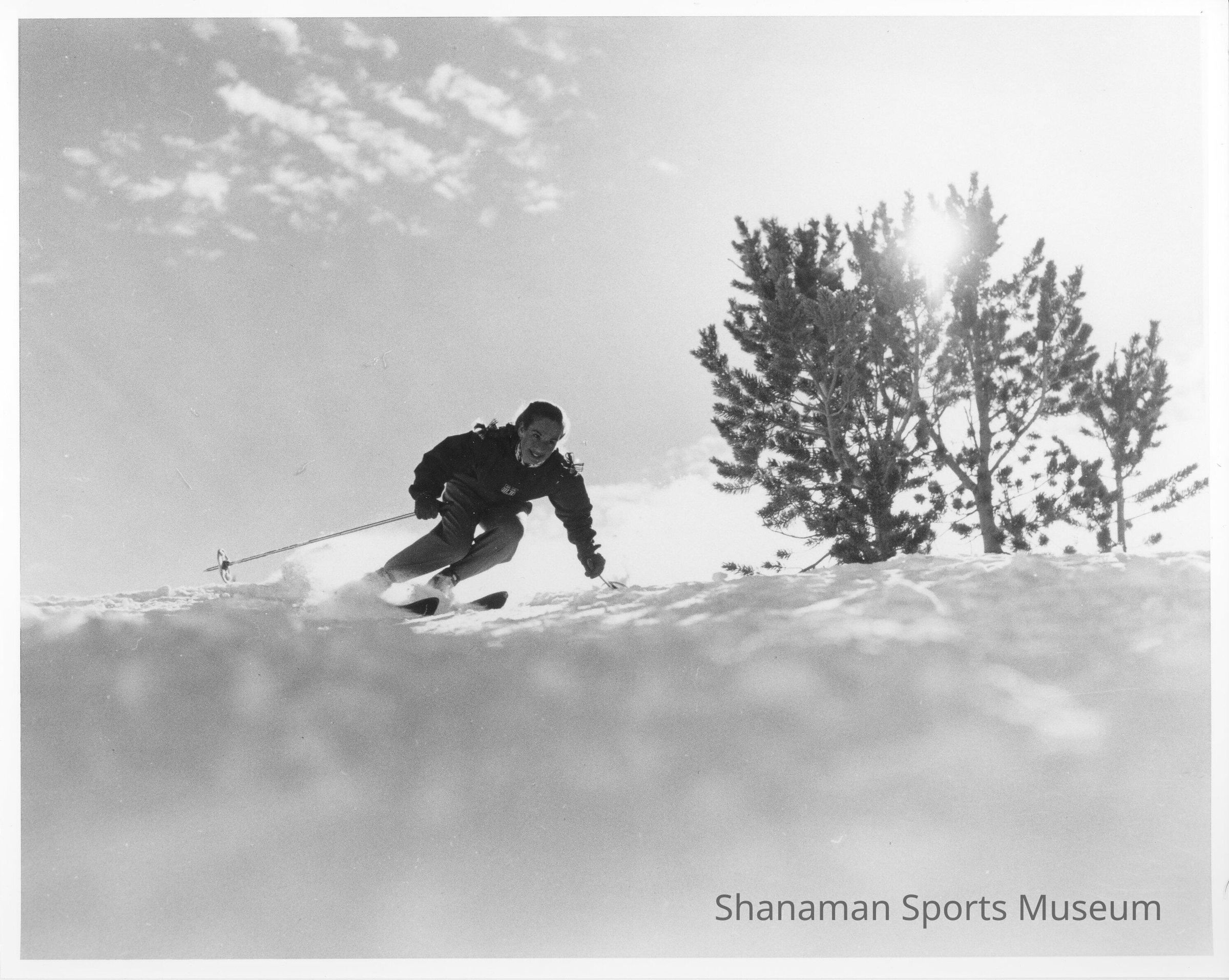 Gretchen Kunigk Fraser of Tacoma shows perfect form with knees bent deeply as she skis down a hill flanked by small trees in this photo, c. 1940s. Gretchen, known for her signature braids, was the first American to win an Olympic gold medal in skiing, finishing first in the women's slalom in the 1948 Winter Olympics in St. Moritz, Switzerland. She took the silver medal that year in the women's combined event and ultimately became known as America's Lady of Skiing. Gretchen Fraser was born in 1919 to parents who were German and Norwegian immigrants. Her mother taught her to ski at age 13 and she excelled under the tutelage of Otto Lang, later competing on the University of Puget Sound ski team. She met 1936 Olympian Donald Fraser in 1938 and the two married the following year. Both Frasers were members of the U.S. Olympic team in 1940, when the Games were cancelled due to World War II. Following her Olympic victory, Kunigk Fraser retired from competitive skiing but continued volunteer efforts with disabled skiers. She was inducted into the National Ski Hall of Fame in 1960, the same year she was tabbed for the State of Washington Sports Hall of Fame, and is also a member of the University of Puget Sound Hall of Fame. She died at age 75 in February of 1994, one month after Donald, her husband of 54 years, had passed away.Lexicon