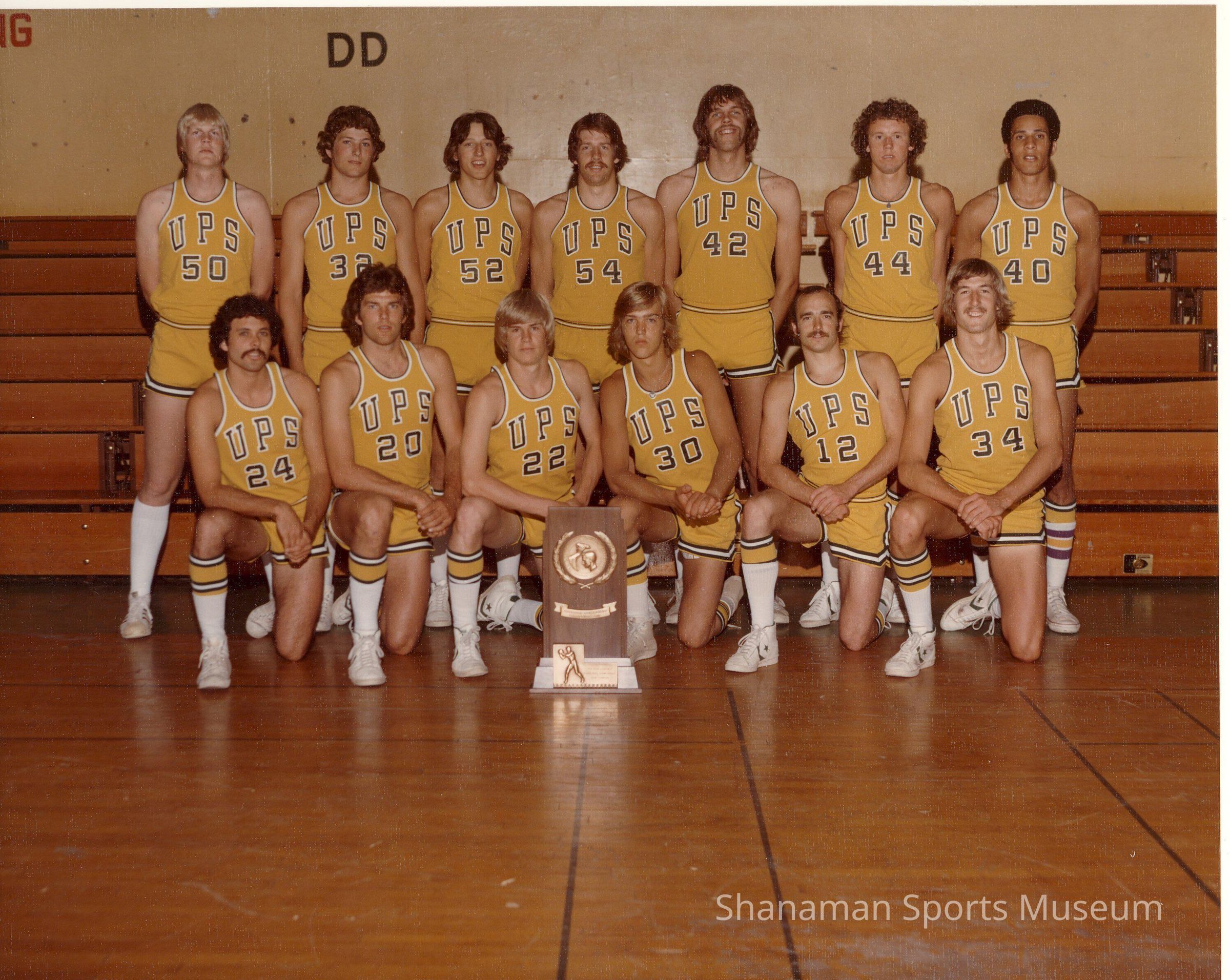 Color photo of the U.P.S. Basketball team with a trophy in front of team. National champions c. 1970s.