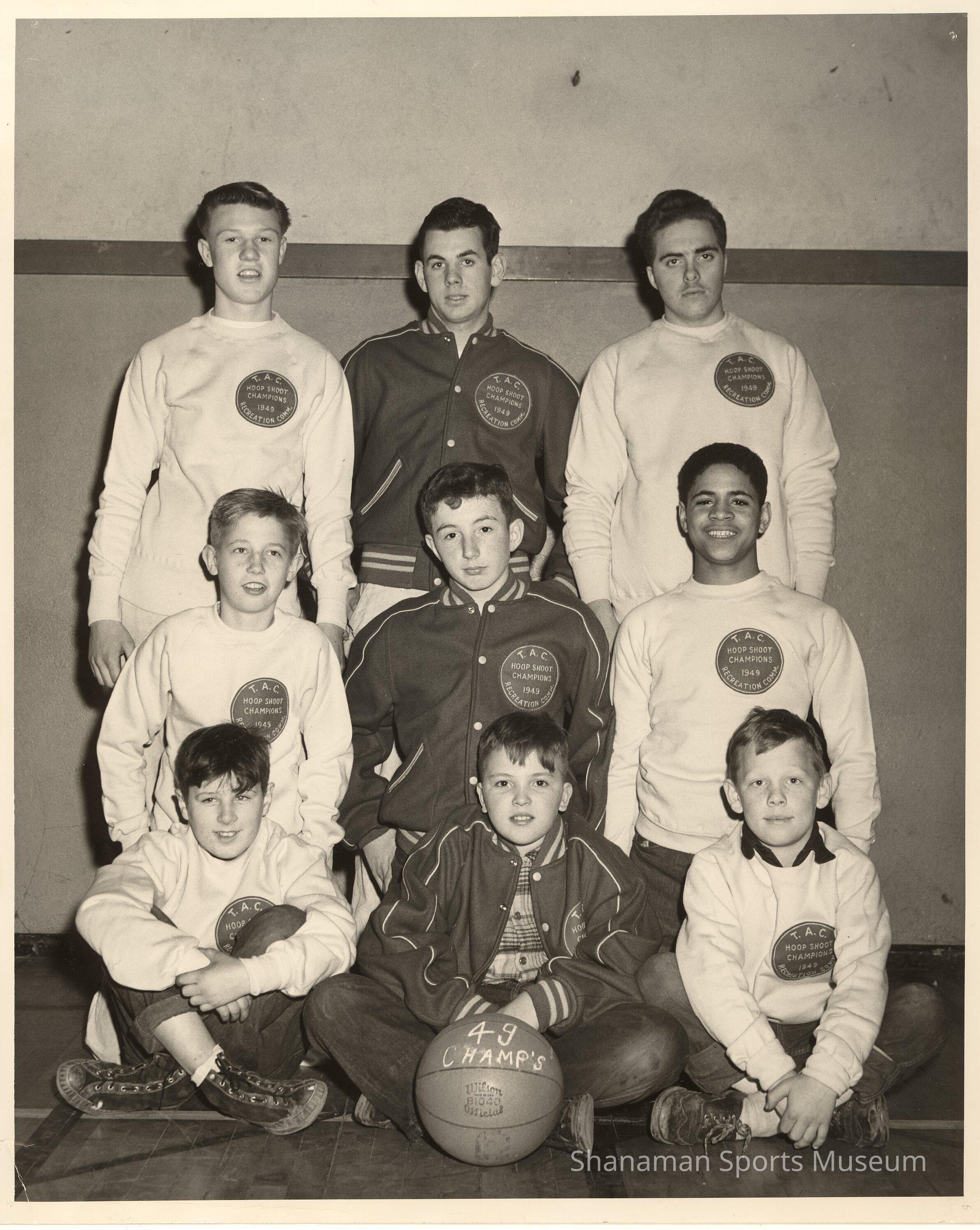 This is a black-and-white photo of the 1949 “Hoop Shoot” champions, an annual free throw shooting contest among junior high students in Tacoma. The nine young boys in the photo are wearing a “TAC Hoopshoot Champion” sweatshirt or jacket. The competition was based on who could make the most free throws in 25 attempts.Lexicon