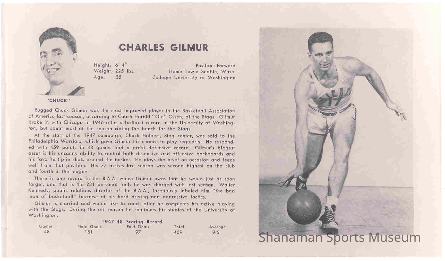 A page from the media guide for the 1948-49 Chicago Stags professional basketball team describes former UW star Chuck Gilmur was the most improved player of the previous season in the Basketball Association of America (a forerunner of the modern NBA). It says Gilmur got his opportunity when the Stags traded starting center Chick Halbert to the Philadelphia Warriors early in the season. Gilmur responded by averaging nearly 10 points a game and playing superb defense for Stags. He also set a league record for fouls committed (231), thus earning his nickname, “elbows.” Gilmur had also been the star of the Stags’ upset playoff victory over the Washington Capitols by using his “brainy and aggressive” defense to shut down Washington star Horace “Bones” McKinney. After five seasons in pro basketball, Gilmur spent nearly 30 years coaching and teaching in Tacoma. He coached 14 years at Lincoln High School and another 14 years at Mount Tahoma High School.Lexicon