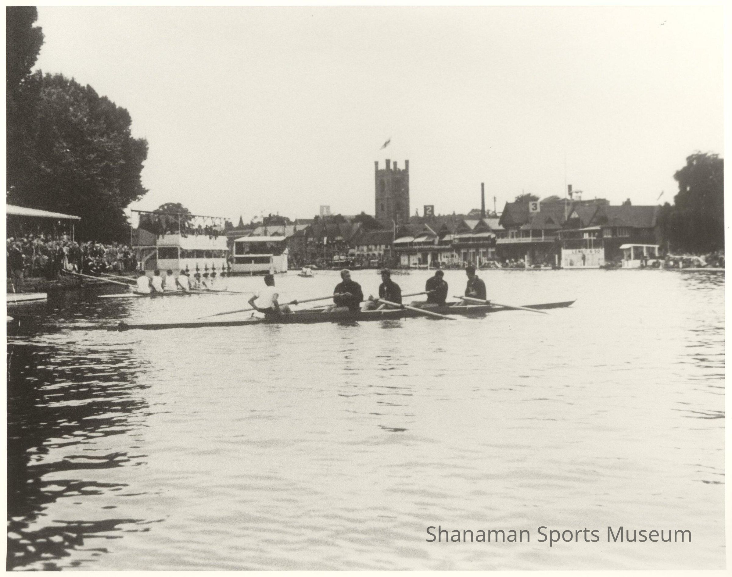 B/W copy print of the 1948 UW gold medal winning 4-man rowing team and coxswain. The are afloat in a British (London) waterway. Grandstand to left.Relationships