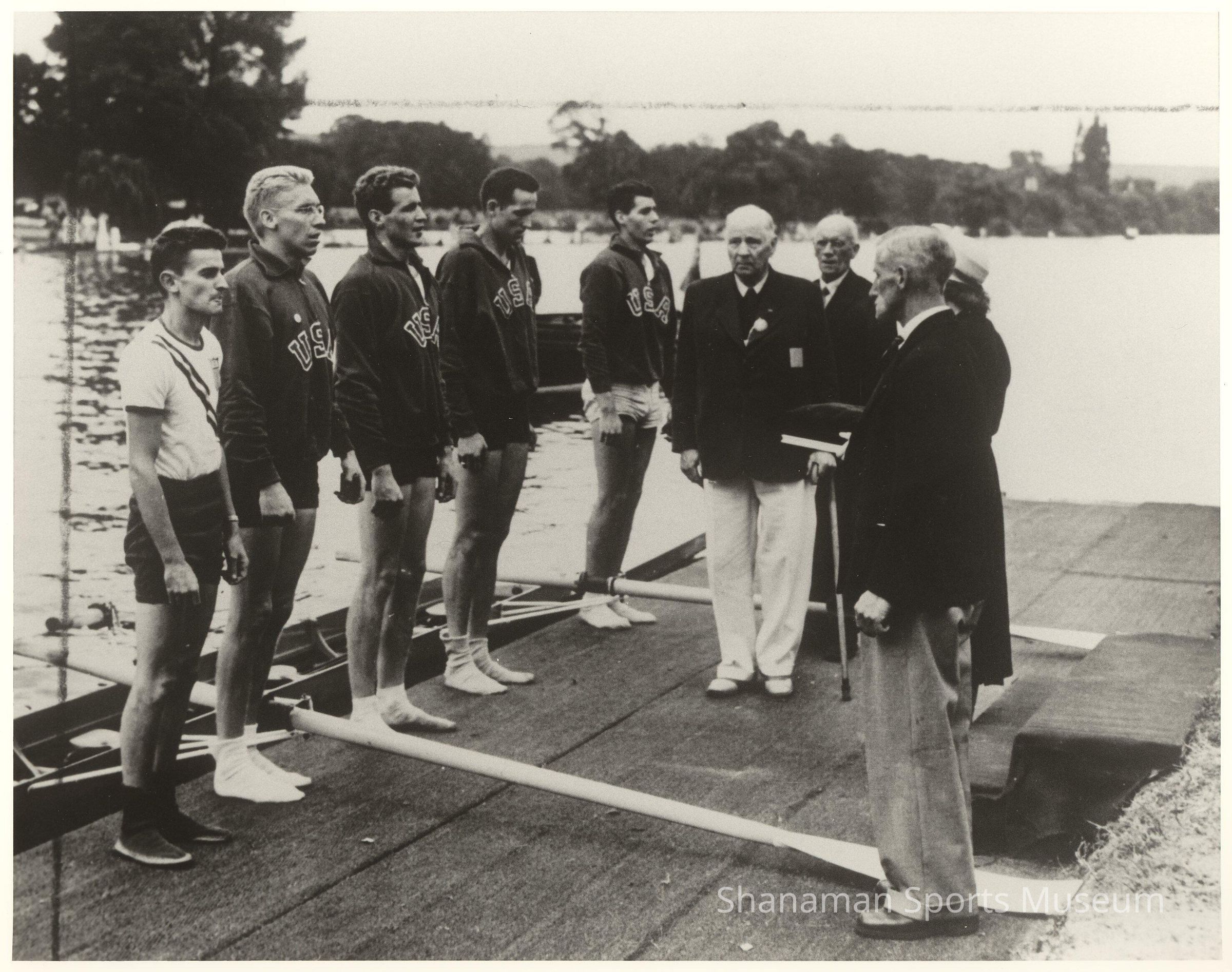 From left, coxswain Allen Morgan, Warren Westlund of Olympia, Bob Martin of Tacoma, Bob Will of Seattle and Gordy Giovanelli of Everett prepare to receive the gold medals they won at the 1948 Olympics in London. The University of Washington teammates beat Switzerland by three seconds in the finals. Denmark took bronze.