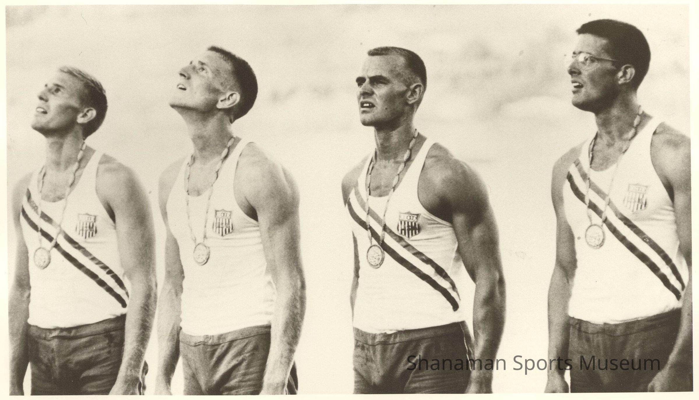 From left, John Sayre, Rusty Wailes, Ted Nash, and Dan Ayrault stand during the gold medal presentation at the 1960 Olympics in Rome. Sayre, a Clover Park High graduate, and Ayrault, who attended Tacoma’s Lowell Elementary and Jason Leigh Junior High, helped the team move from last place after 500 meters to win the race by more than two seconds over Italy.Lexicon