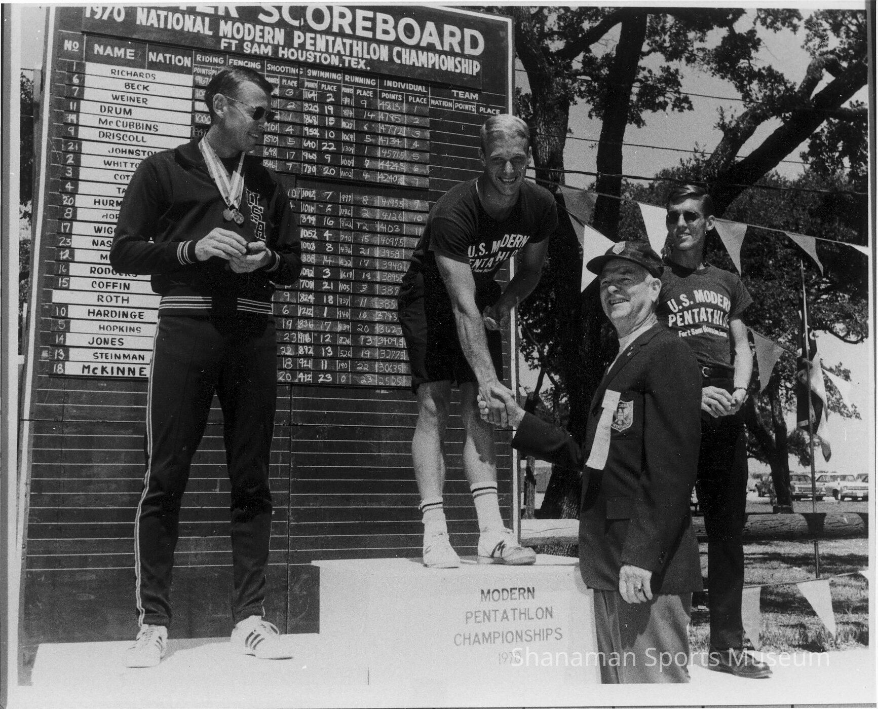 Stadium High graduate Chuck Richards accepts the gold medal at the 1970 Modern Pentathlon National Champions in Fort Sam Houston in San Antonio, Texas. It was the first of three consecutive national titles that culminated with a trip to the 1972 Olympics in Munich, Germany. He finished ninth at the 1972 Games. Modern pentathlon requires competing in swimming, running, shooting, equestrian show jumping and fencing.Lexicon