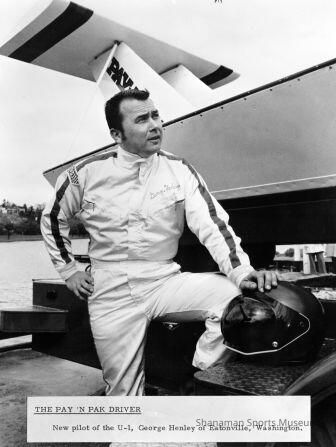 Eatonville unlimited hydroplane driver George Henley stands next to the U-1 Miss Pay 'N Pak.