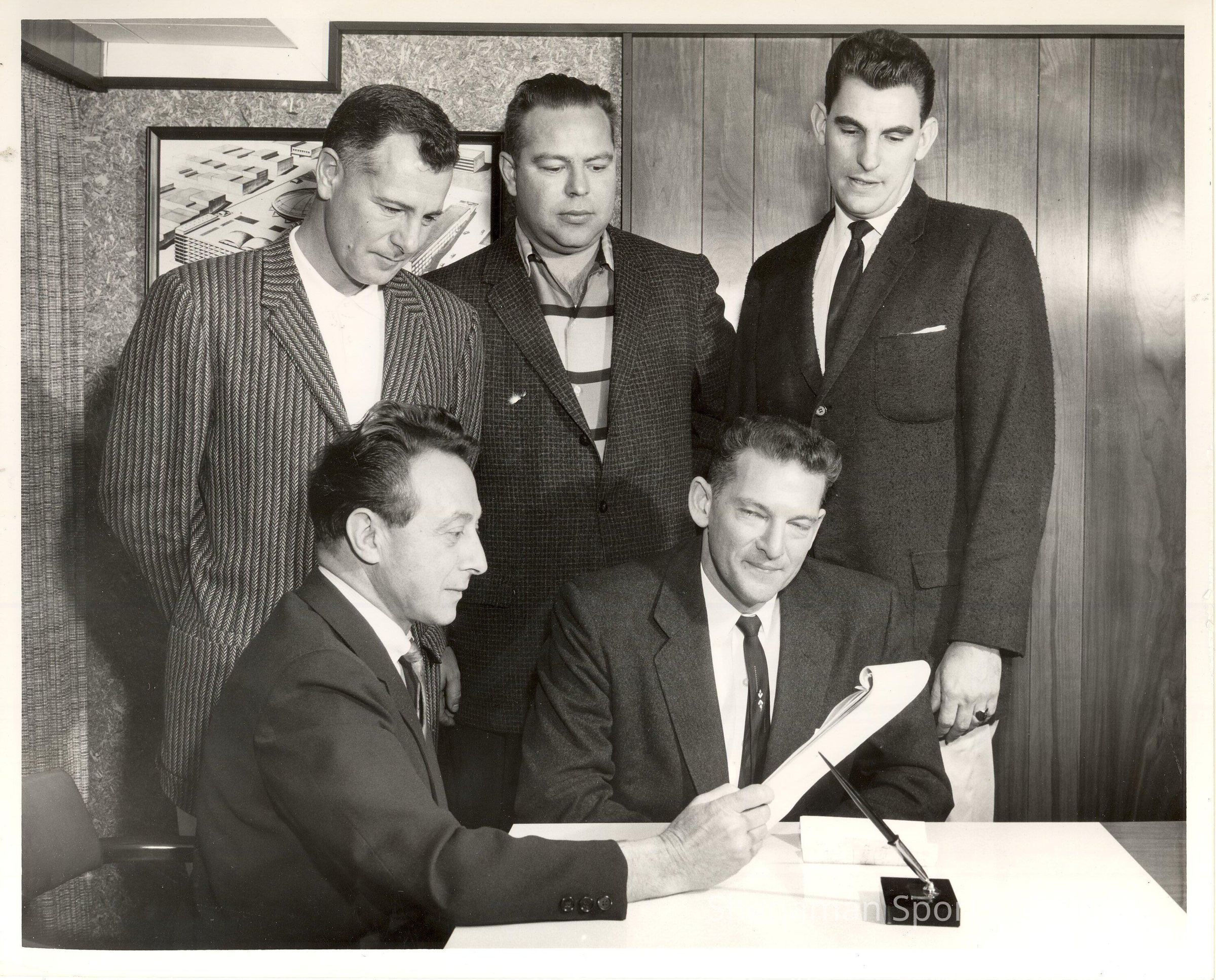 A gathering of Tacoma Athletic Commission presidents pose for a picture while reviewing notes on a legal pad. Standing, from left, Roger McDonald (1965 TAC president), Neil Hoff (1961-62) and Bill Gazecki (1963) overlook Morley Brotman (1959) and Jim Rondeau (1960). On the wall behind the men is a schematic of a proposed Tacoma convention center intended to be built between 9th and 11th streets and Tacoma Avenue and Market Street. The project eventually became the Tacoma Dome.