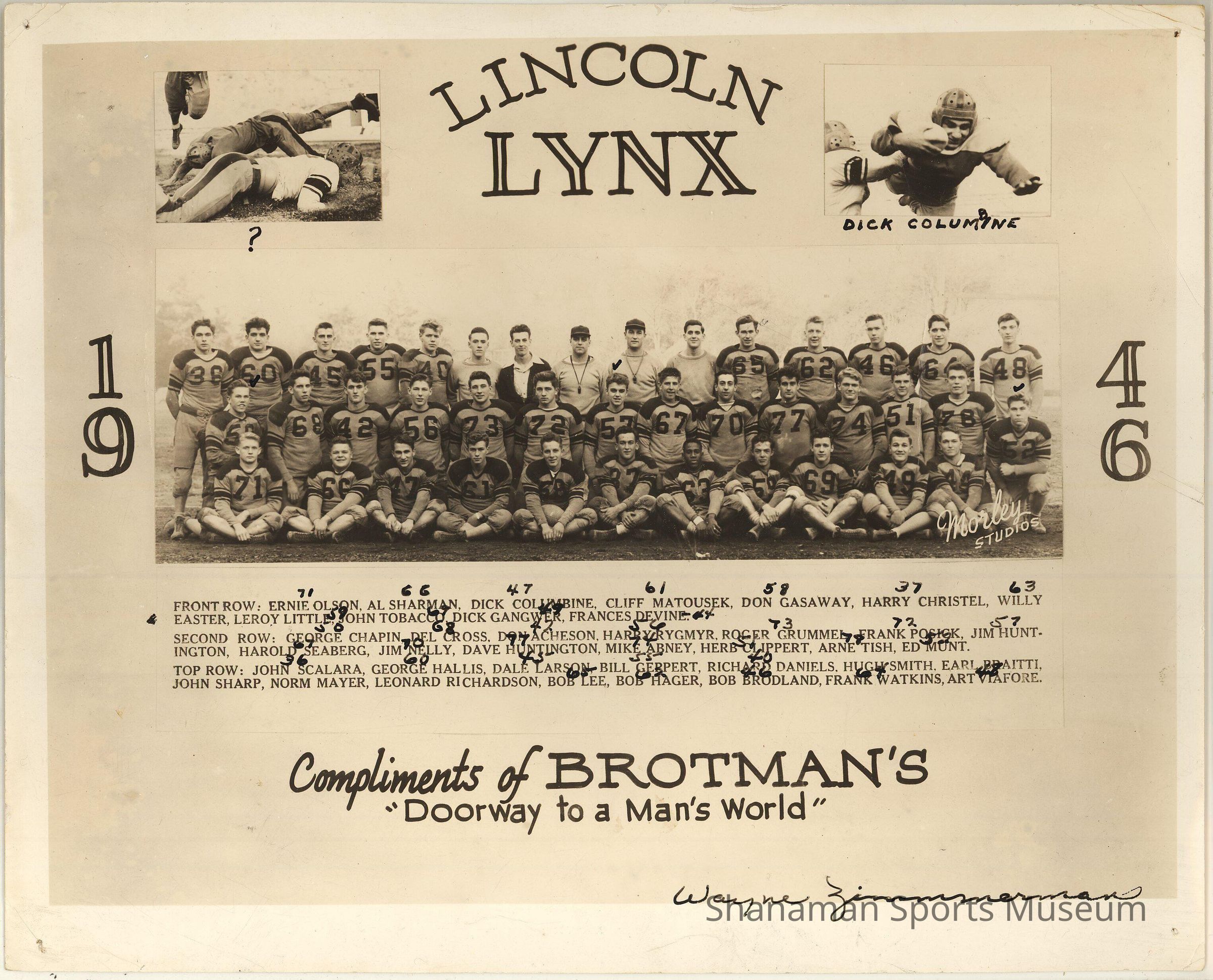 Wayne Zimmerman played on the Lincoln Lynx's high school football team back in 1946. Zimmerman, who signed the photo, went on to become an editor at the Tacoma News Tribune and worked there many years. Lincoln High School opened in 1914 and over the years the school's mascot has changed from the Lynx to the Railsplitters and to the current Abes.Lexicon