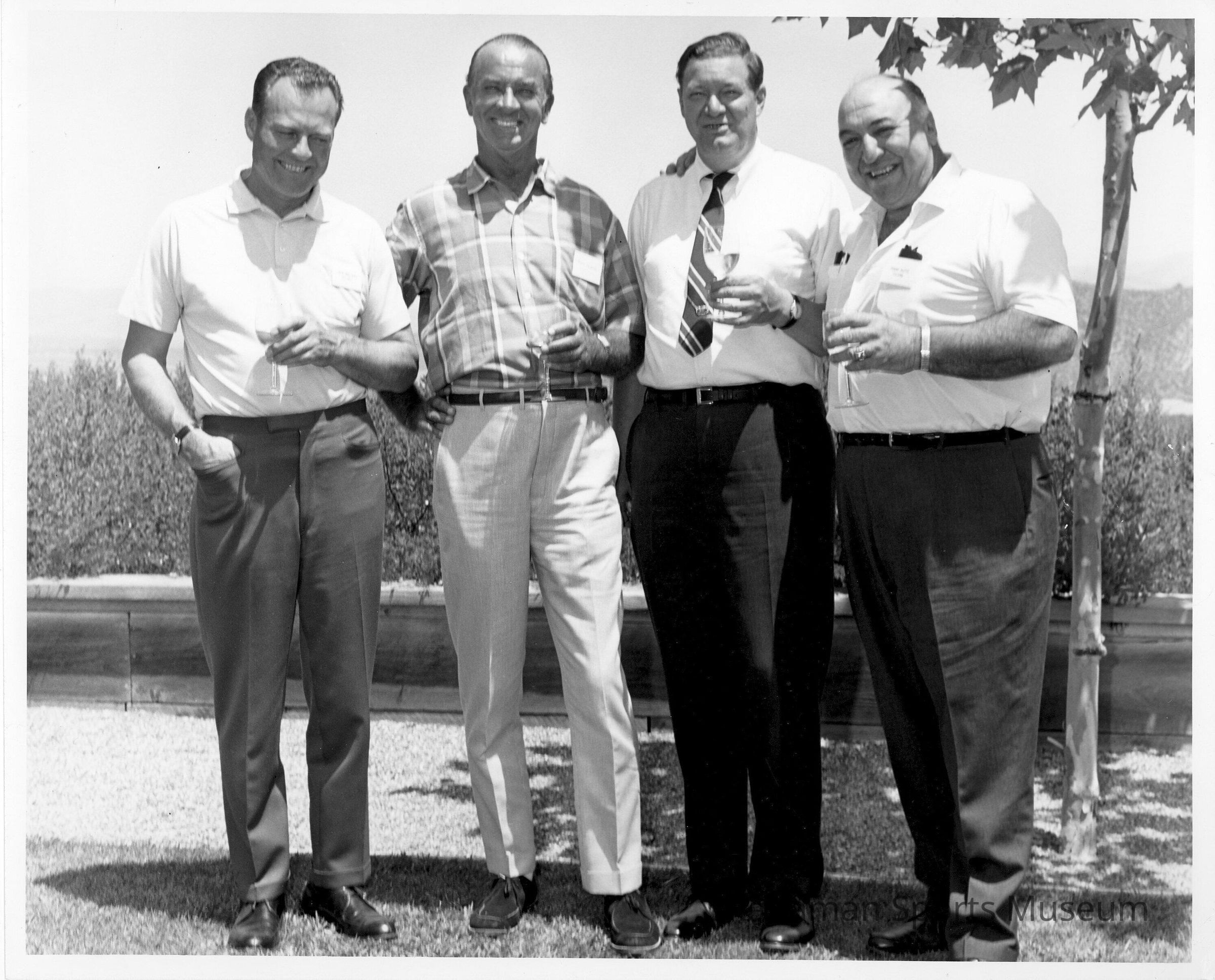 In this black-and-white photo of four men standing and holding a glass of white wine, Jack Walters is on the left and Frank Ruffo is on the right. Walters is considered to be the best left-handed golfer of his time. He golfed 35 years, golfing from 1932 to 1967. He won the Pacific Northwest lefties title an impressive 16 times and the Western States' championship twice. Ruffo played in the Industrial League for 12 years with the Cammarano Bros., in the city league. In 1937, he played on the Johnson Paint team in Shelton placed fifth at nationals in Wichita, Kansas. Walters and Ruffo have booth been inducted into the Tacoma-Pierce County Sports Hall of Fame.Lexicon