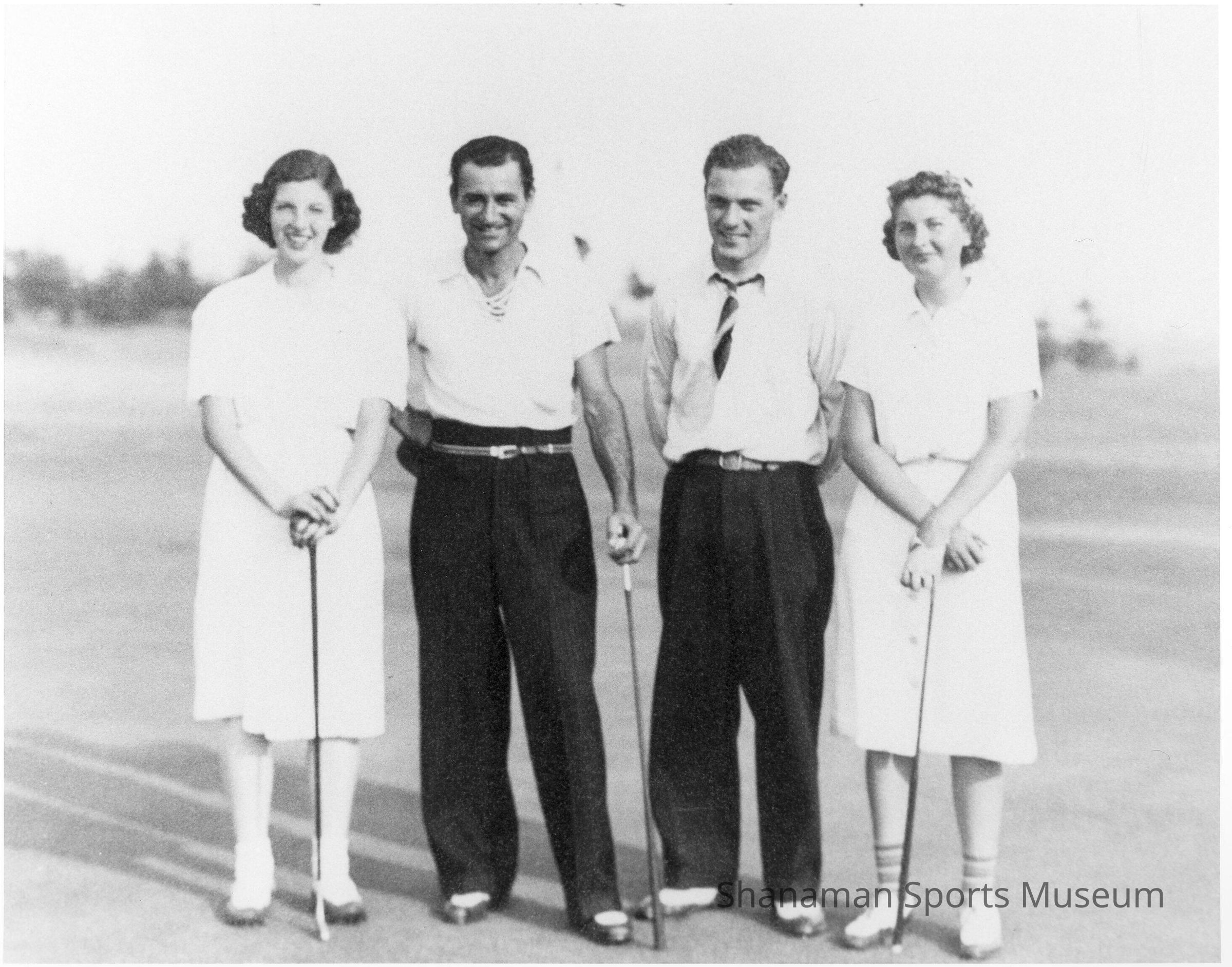 Pat Lesser Harbottle, standing on the left, poses for a photo while standing on a golf course holding her golf clubs. In the 1950s, Harbottle played on Seattle University's golf team and became the first woman to play on a college men's team. On that team, she met her future husband, John Harbottle. In 1948 at just 14 years old, she won the first of two back-to-back Seattle women's city titles. In 1952, she had a successful year as she won the Pacific Northwest, the Washington Amateur, the Oregon Amateur and NCAA titles.Lexicon