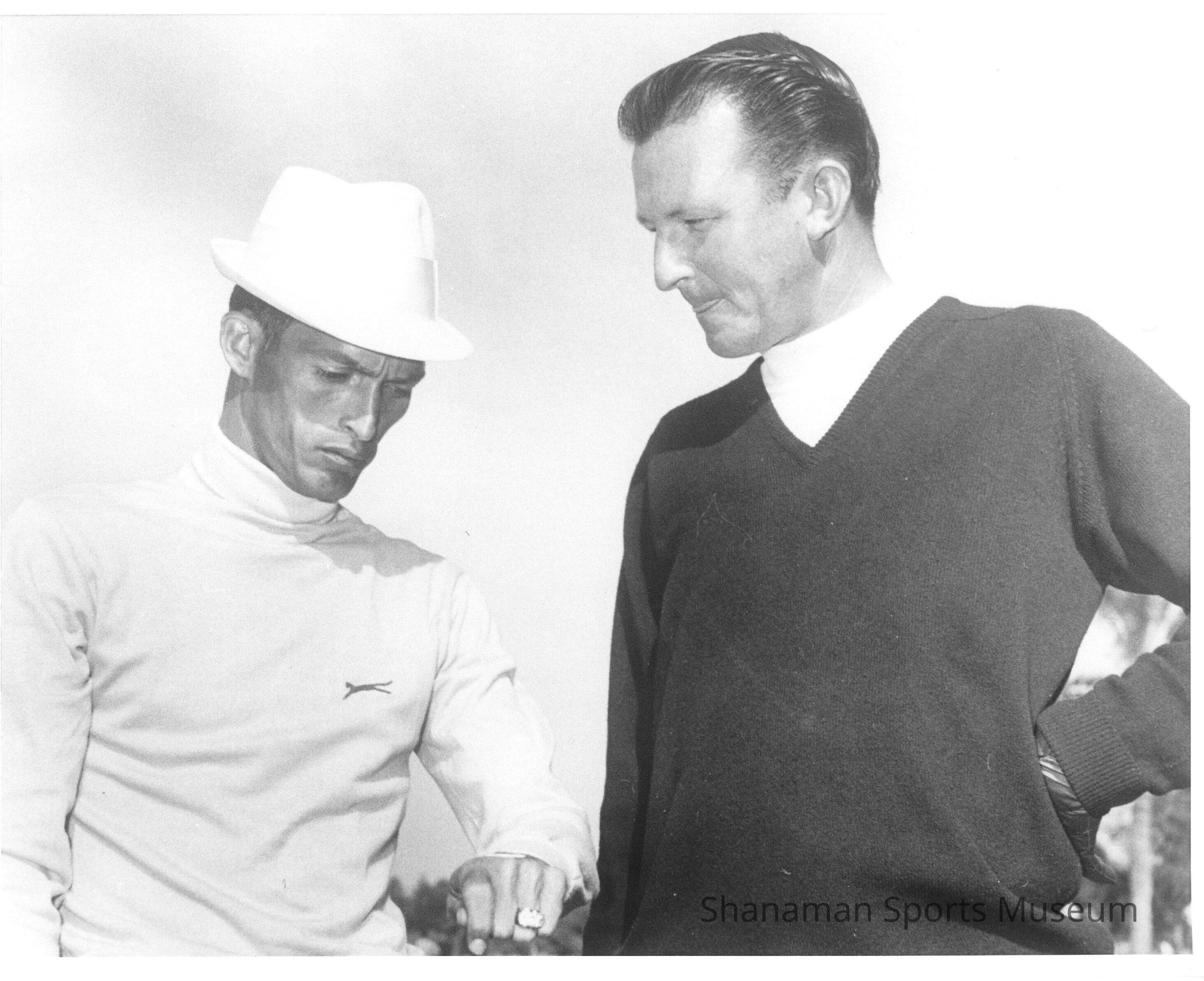 Ken Still, wearing a dark V-neck sweater, stands with an unidentified golfer as they prepare for another round of golf. Still, who was born in Tacoma in 1935, joined the PGA Tour full time in 1960 and played on the tour for 23 years. Five months after he graduated from Clover Park High School in 1953, he turned pro part time and then in 1960 joined the PGA full time. Still won three PGA tournaments, winning two in 1969 and one in 1970. He died on March 19, 2017, which was the last day of the Arnold Palmer Invitational that was played in Orlando, Florida. That was the first PGA Tour event Still won – 48 years prior. A gregarious Still developed close friendships with Arnold Palmer and Jack Nicklaus in the early 1960s and never lost touch.Lexicon