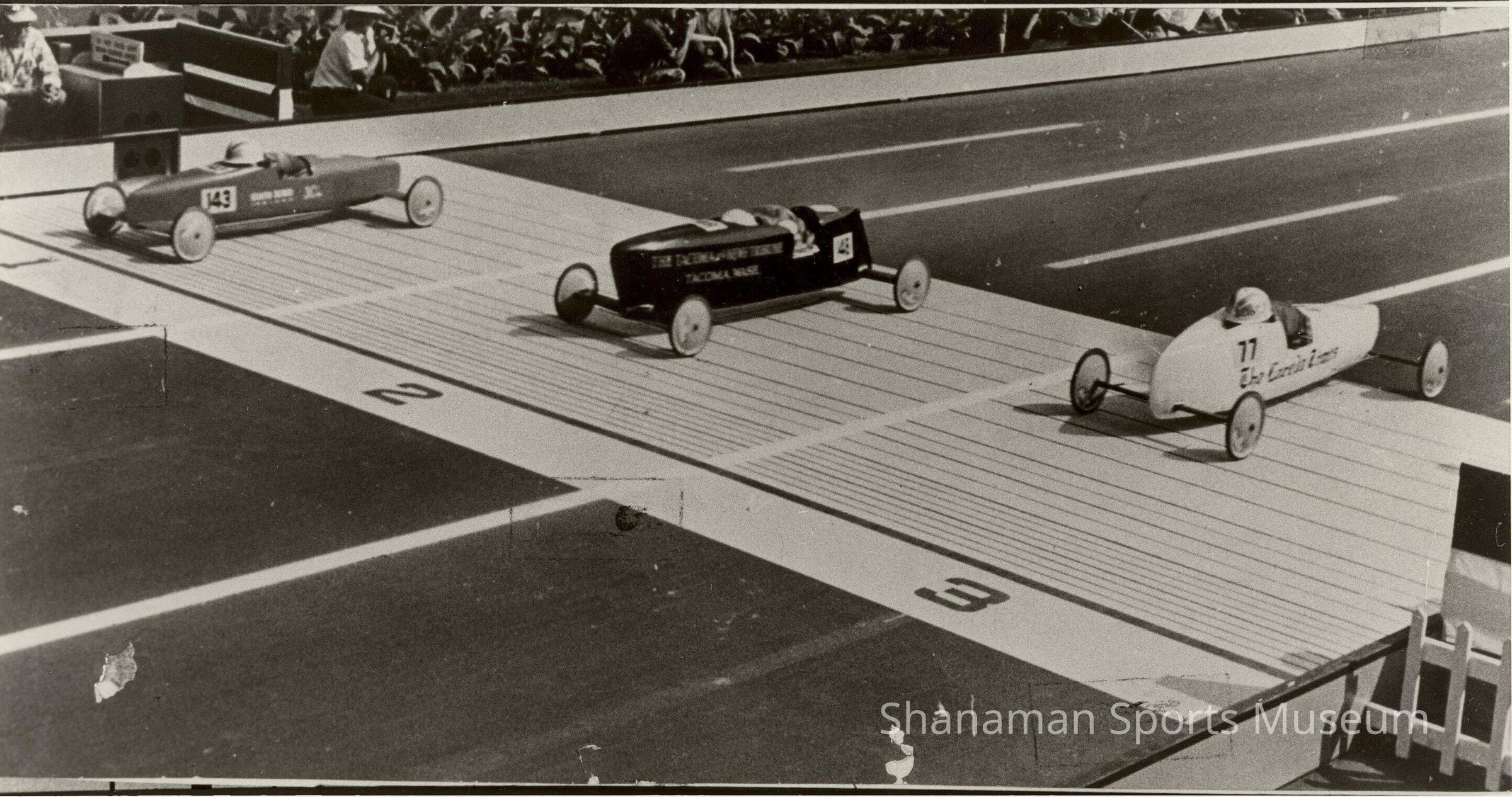 In a close finish, three riders race to the finish line of the All-American Soap Box Derby in Akron, Ohio. The center car was sponsored by the Tacoma News Tribune. The race for the national championship soap box derby has been held nearly every summer. Riders ages 11 to 17 build their own derby cars with the help of their dad and the cars are powered by gravity. Starting in early 1970s, nationals change from one division to three divisions and there were weight limitations. For stock cars and drivers it was 200 pounds, for super stocks and drivers it was 230 pounds and for masters and drivers it was 255 pounds.Lexicon
