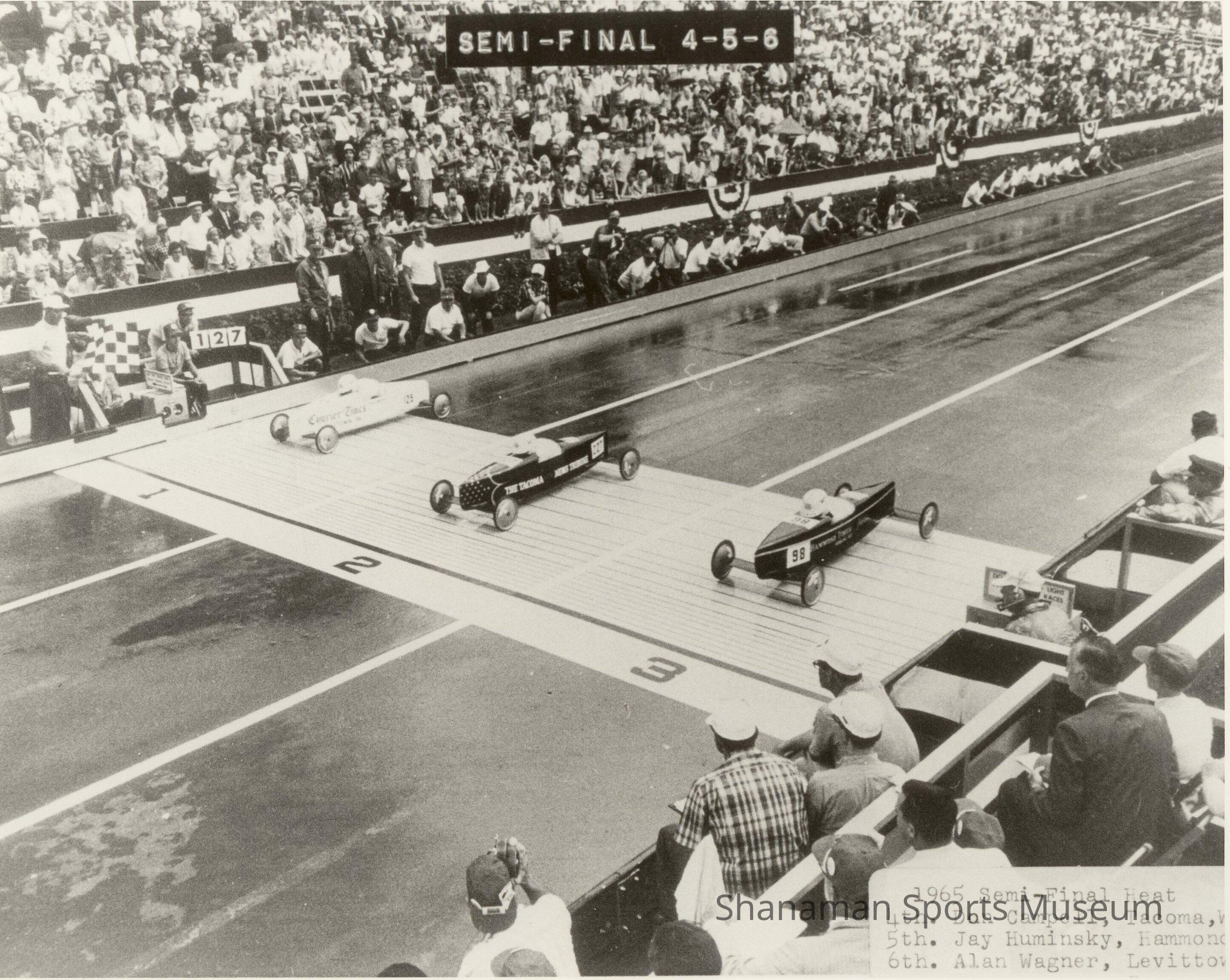 With a large crowd watching, Don Campbell of Tacoma races in the semifinals of the 1965 national championship of the Soap Box Derby. Campbell, racing in car #227, placed fourth overall in the competition at the All-American Soap Box Derby, which were held at Akron, Ohio, every July.Lexicon