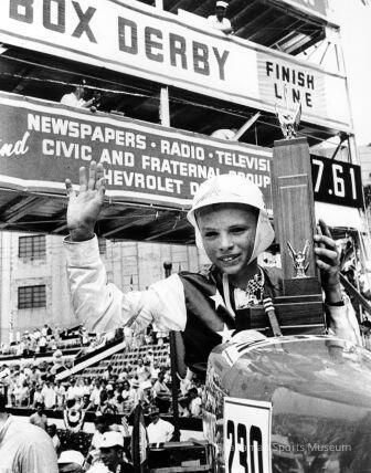 Sitting in his soap box derby car that he and his dad made, David Krussow smiles and waves as he's holding his trophy for placing first place in 1964 at the national All-American Soap Box Derby championship in Akron, Ohio. Krussow's smiling parents are on his right and a race official presented the trophy is on his left. The homemade soap box derby cars have no motor and are driven only by gravity.Lexicon