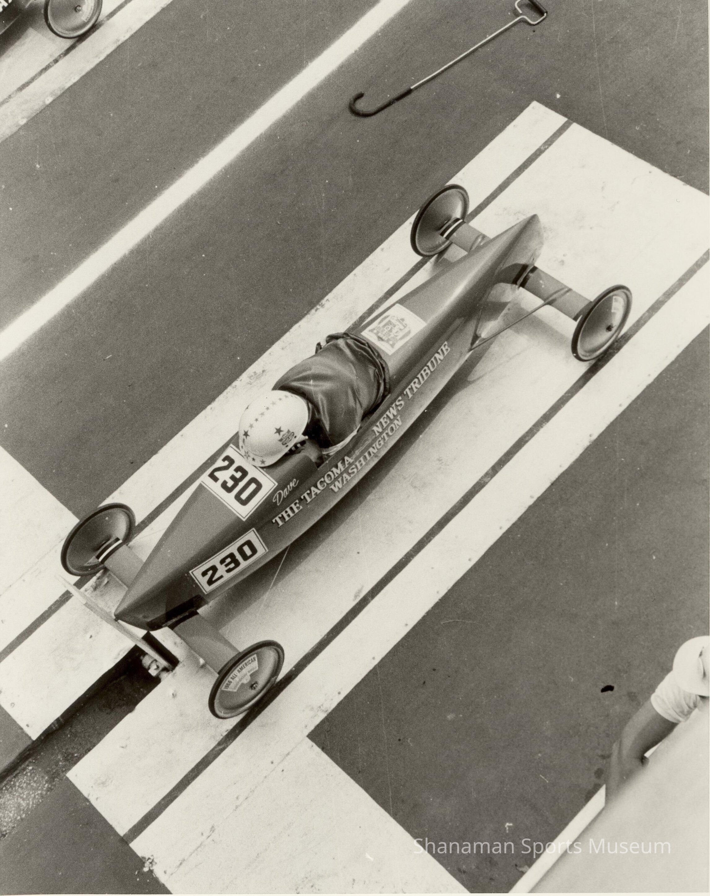 In a photo taken from the starting gate, a 12-year-old David Krussow gets off to a fast start at the National Soap Box Derby championship race in Akron, Ohio, in 1966. Krussow ended up winning the championship that year. In his support, the Tacoma News Tribune helped sponsor Krussow and the newspaper's name was put on the side of his derby race car. Krussow's name was also on the side of his car.Lexicon