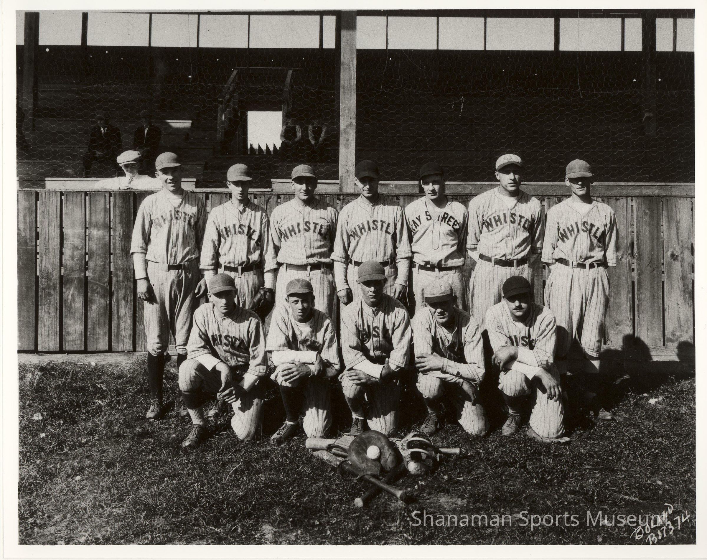 Team photograph of the Whistle Bottle Company baseball team in their pinstripe uniforms. The Whistle Bottle Company team was a local baseball team that played a part of the Tacoma City Baseball League. The first official meeting of the Tacoma City Ball League was held on April 27, 1921 which was organized by the Tacoma Commercial Club with Art Graham, Dr. James Egan and Charles Winegar as its officers. The first teams were Standard Oil, Tacoma Grocery, Fairmont, Sound Tire Company, Northern Pacific Railroad and Wheeler-Osgood Company. Year two saw the league add Teddy’s Tigers, Kay Street, Tacoma Avenue, Smelter Athletic Club, Milwaukee Rail Road, LaMunas and the American Legion teams. The first games were played at Stadium Bowl in Stadium District of downtown Tacoma before being moved to the Lincoln Bowl starting in 1926.Lexicon