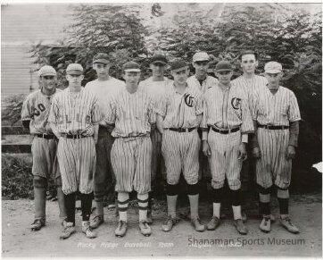 A black and white photograph of the Rocky Ridge baseball team of the Valley League. The Valley League consisted of teams from small towns in the Pierce County valley areas as well as communities the surrounded them. Many of the teams came from Carbonado, Puyallup, Sumner, Yelm, Eatonville, Roy, South Prairie, Rocky Ridge, Spanaway, Morton and Black Diamond and they provided added competition for teams from Tacoma.Lexicon