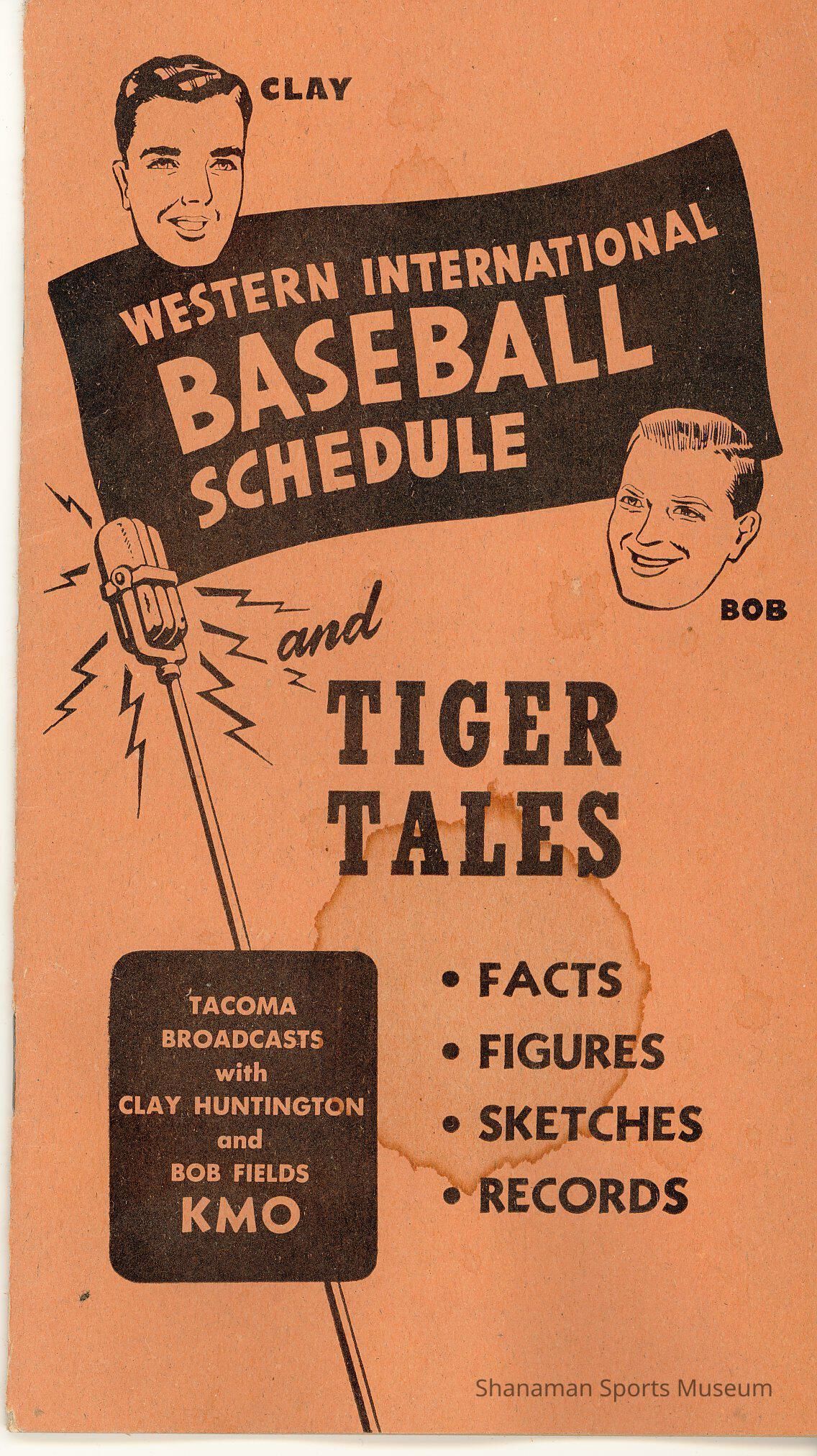 1950 Tacoma Tigers media guide called "Tiger Tales". Western International Baseball Schedule and Tiger Tales. Orange cover, drawings of heads of "Clay" and "Bob" on cover.