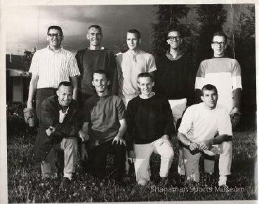 Nine members of the Spanaway Lutheran Church baseball team wear street clothes to pose for a photo.Lexicon