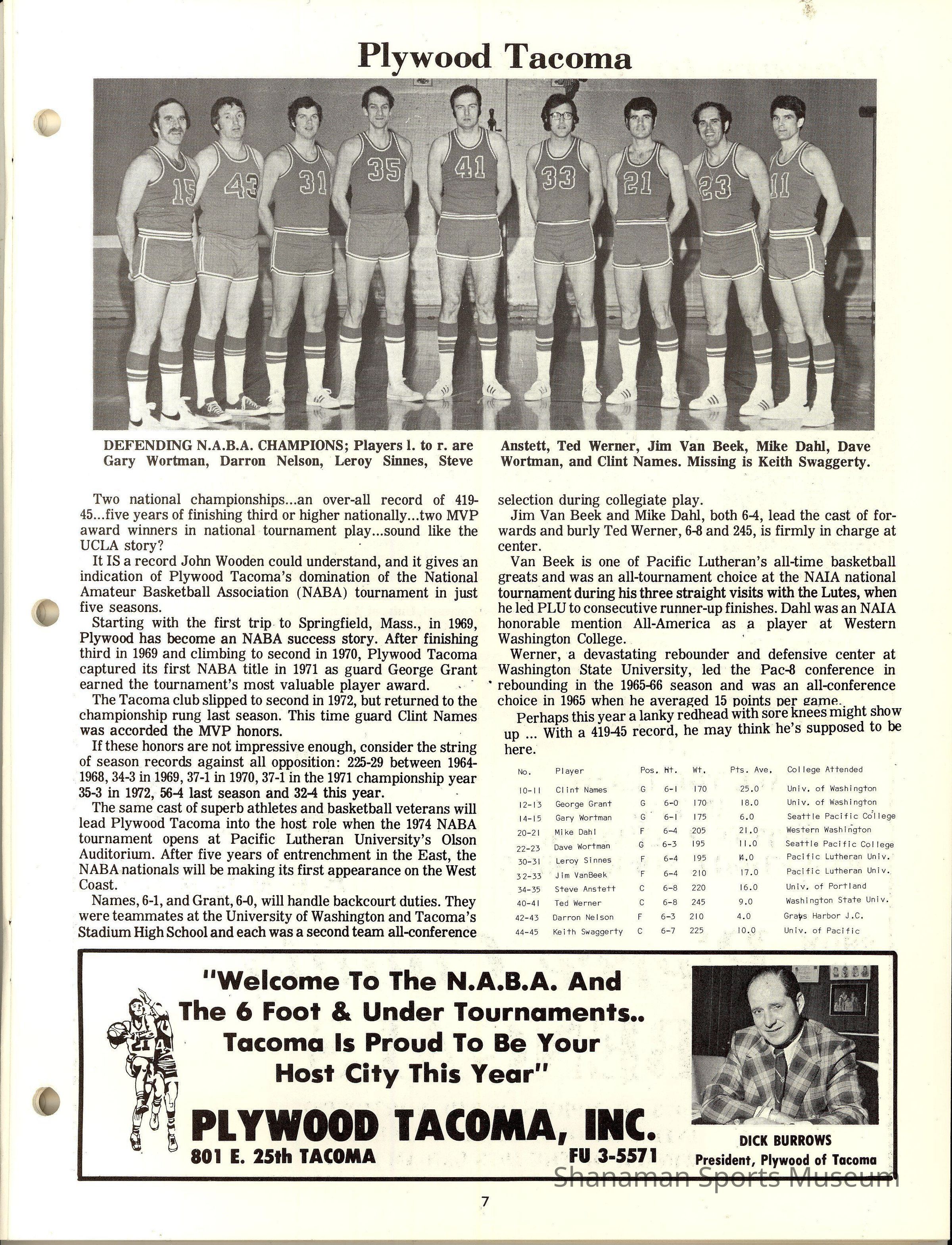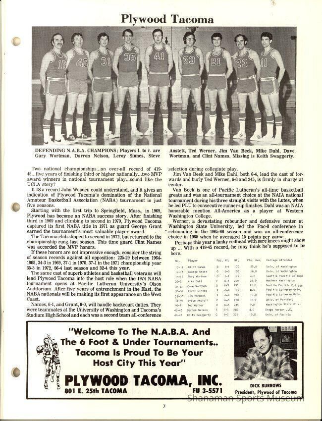 *INC* Souvenir program from NABA National Basketball Tournament held at PLU in 1974 where Plywood Tacoma participat