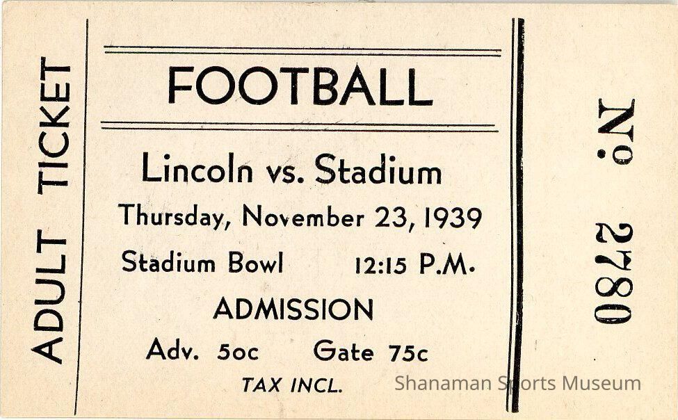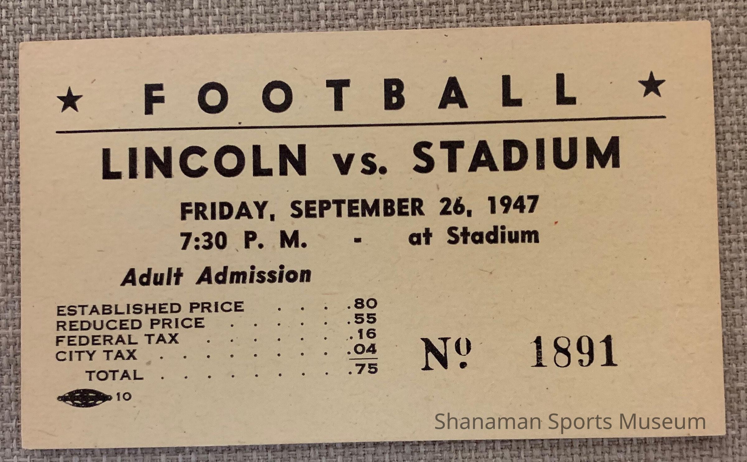 Three football tickets: a. Lincoln vs. Stadium 1939. b. Lincoln vs. Stadium 1942. c. Lincoln vs. Stadium 1947.