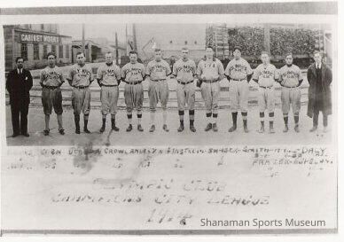 Copy of original b/w photo of the 1914 Olympic Club baseball team standing in a single row with warehouse buildings and train tracks in background.Lexicon
