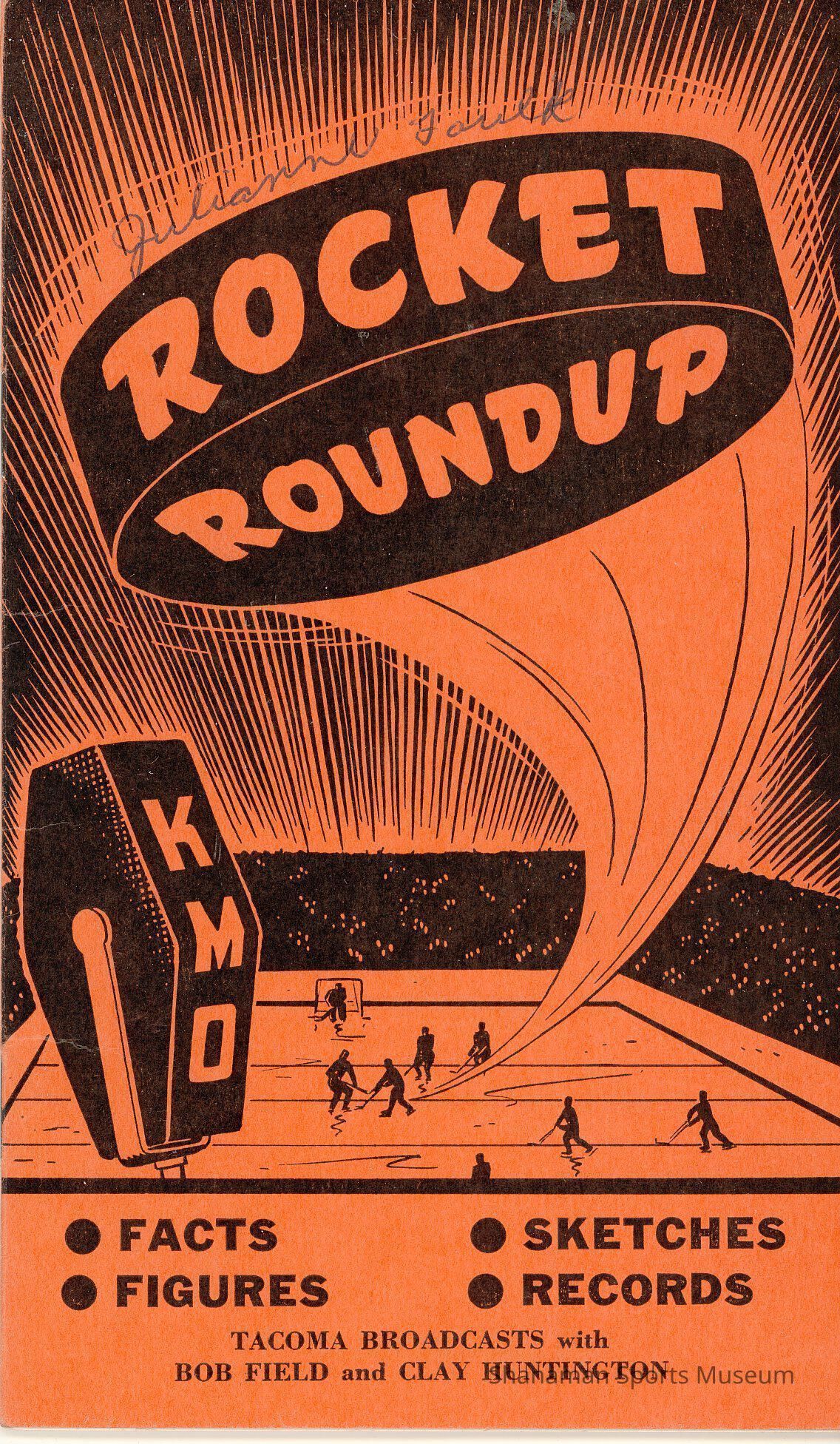 1951-52 Tacoma Rockets media guide (Rocket Roundup). Black and orange cover.