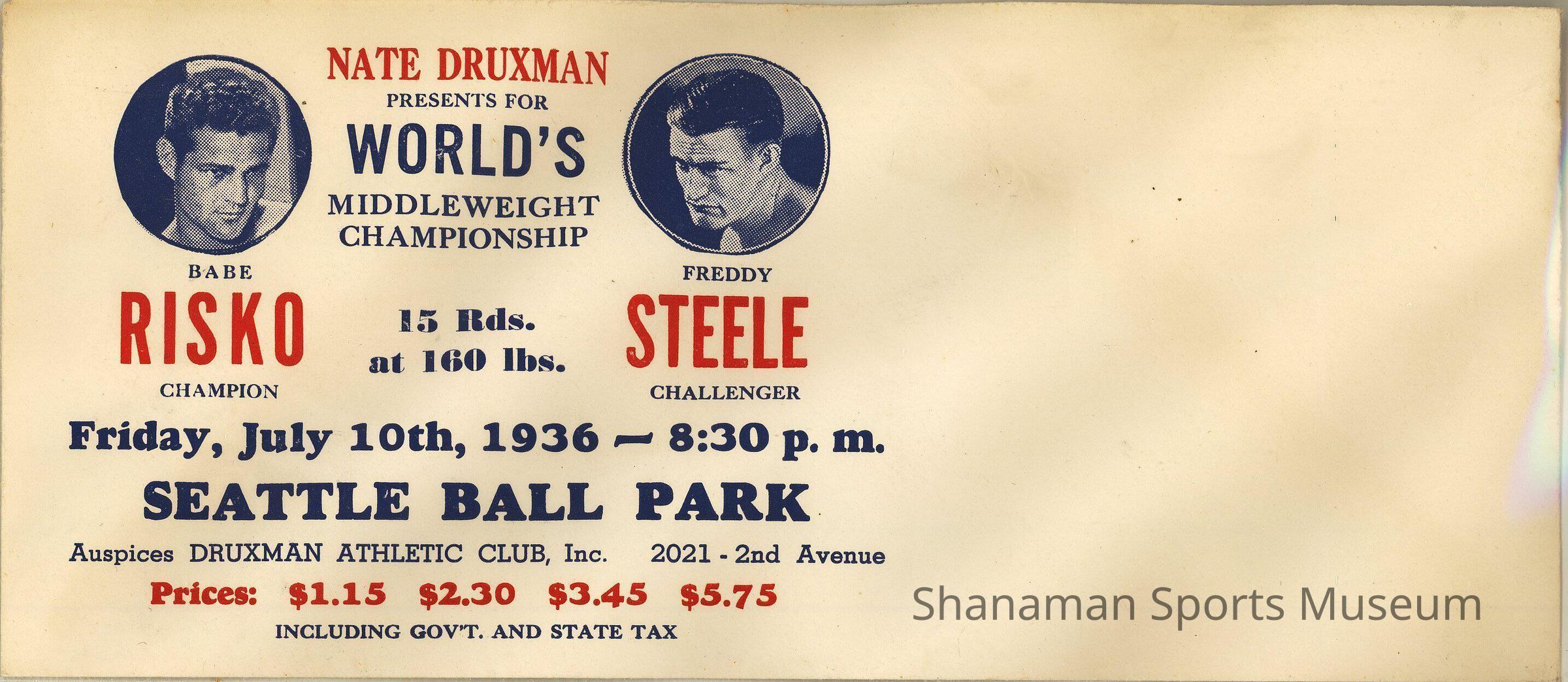 *INC*Ticket envelope of Freddie Steele-Babe Risko fight of July 10, 1936 in Seattle at the Seattle Ball Park for the World's Middleweight Championship