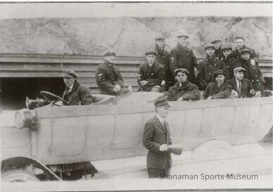 Members of the 1915 South Tacoma Tigers semipro baseball team, wearing heavy wool coats and caps, tour San Francisco atop an open top bus.