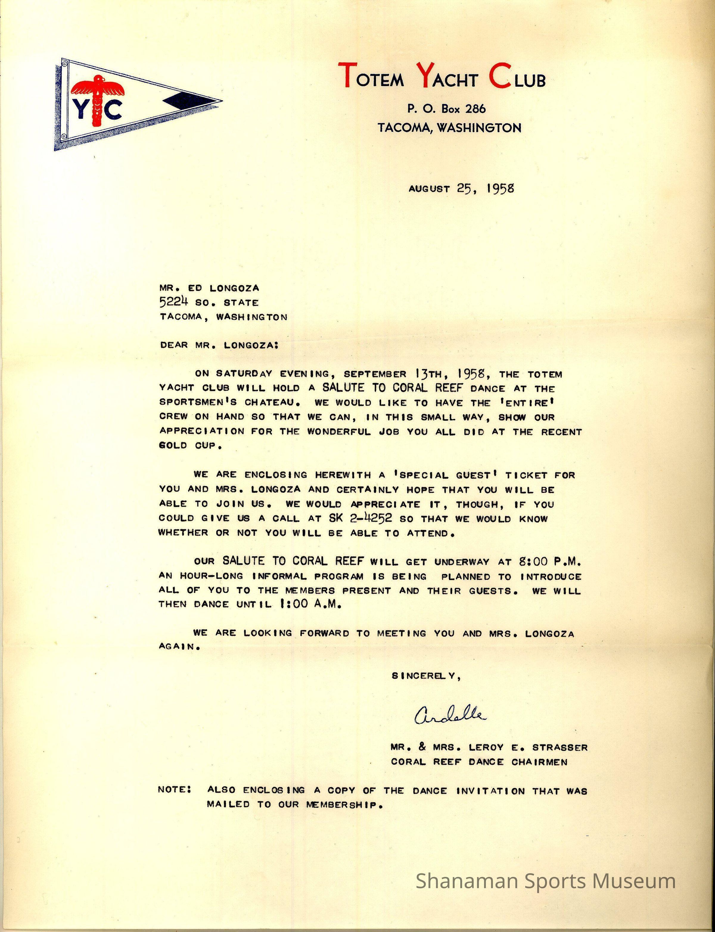 Letter addressed to Ed Longozo announcing a "Salute to the Coral Reef" dance to be held at Totem Yacht Club. Letter dated Aug. 25, 1958 and typed on Club stationary. Event honors all those that worked on the boat.Lexicon