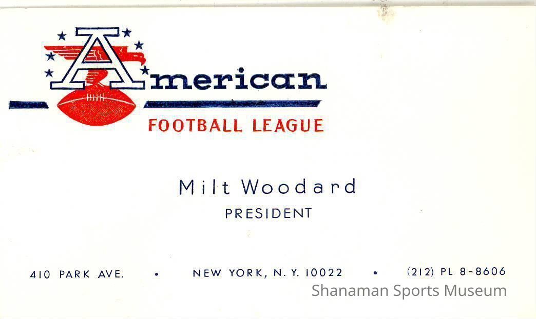 Cardboard name placard identifying Milt Woodard as President of the American Football League.
