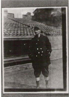 An unidentified member of the 1915 South Tacoma Tigers semipro baseball team poses for a picture while wearing a dark blue jacket.