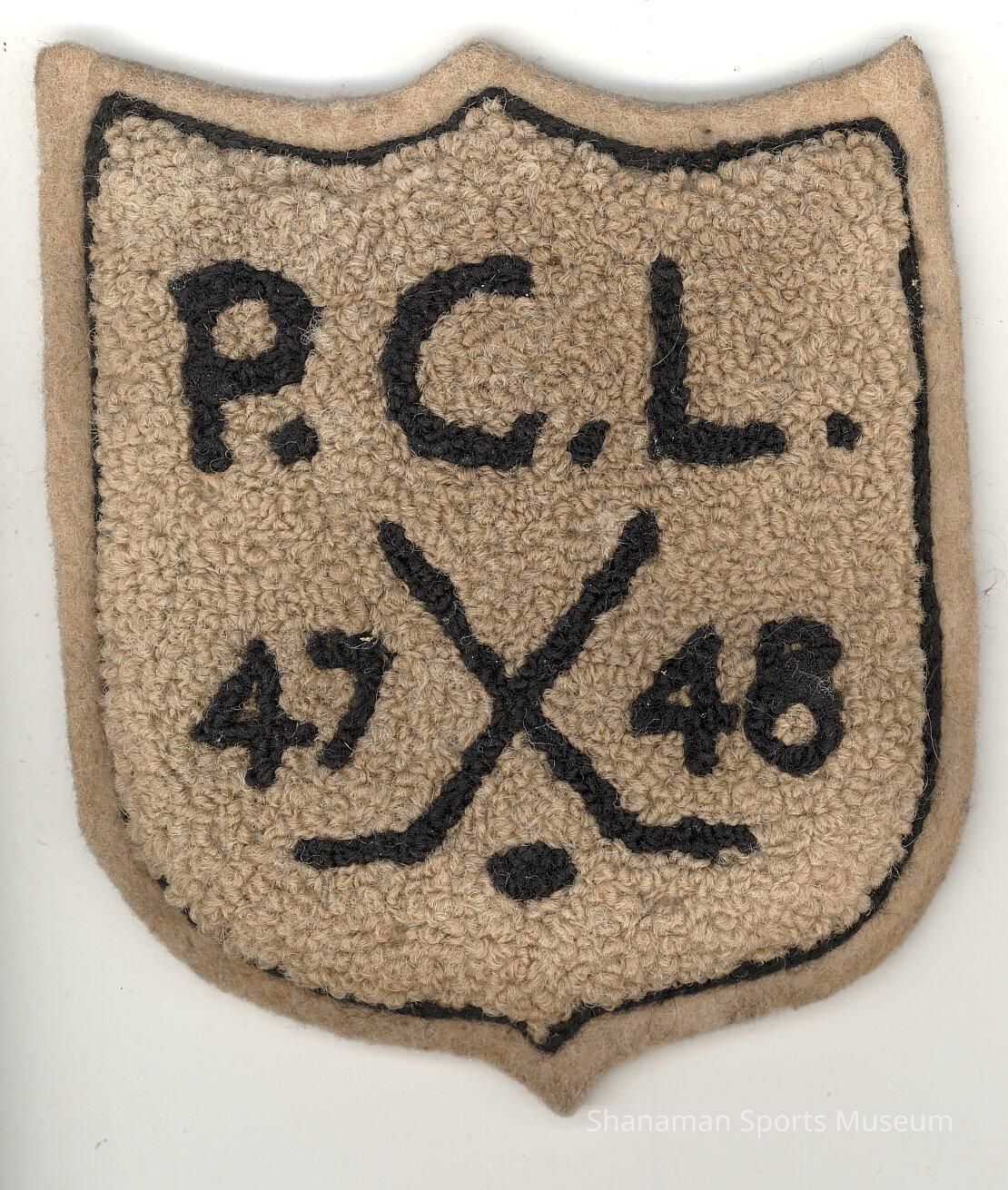 LOAN -Patch, white with blue chenille shield worn on 1947-48 Tacoma Rockets jacket. The team played in the Pacific Coast League. "P.C.L. 47 48".Lexicon
