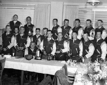 Players for the 1957 Woodworth Contractors baseball team, managed by Marv Scott, pose with trophies at the team banquet after finishing second in the national tournament in Battle Creek, Mich. The Contractors, sponsored by Alden Woodworth, won the 1956 City League championship before taking second at nationals the following season. Metro Parks paid tribute to Woodworth in 1957 by naming a field at Heidelberg Park in his honor.Lexicon