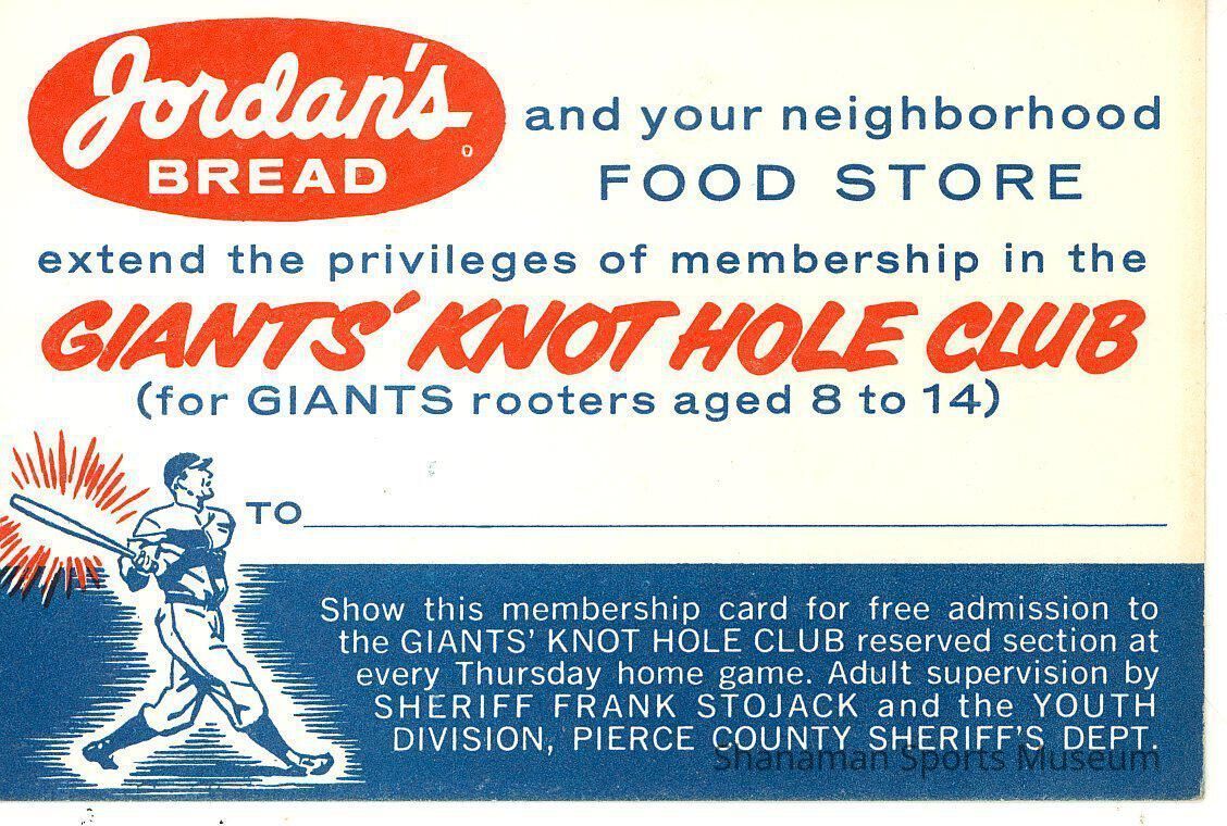 1960 Tacoma Giants Knothole Gang Club card. Sponsored by Jordan's Bread. Tacomas Giants baseball rooters club for children 8-14.Lexicon