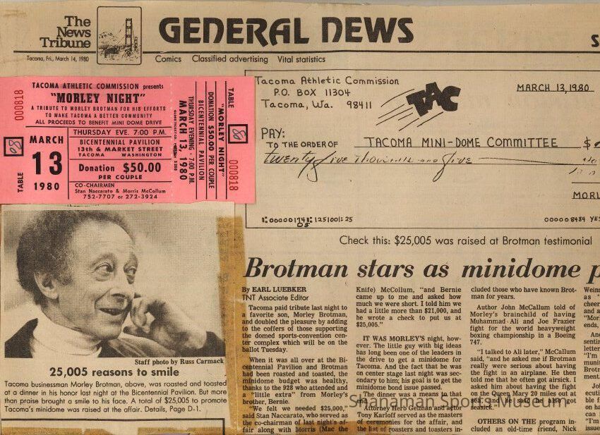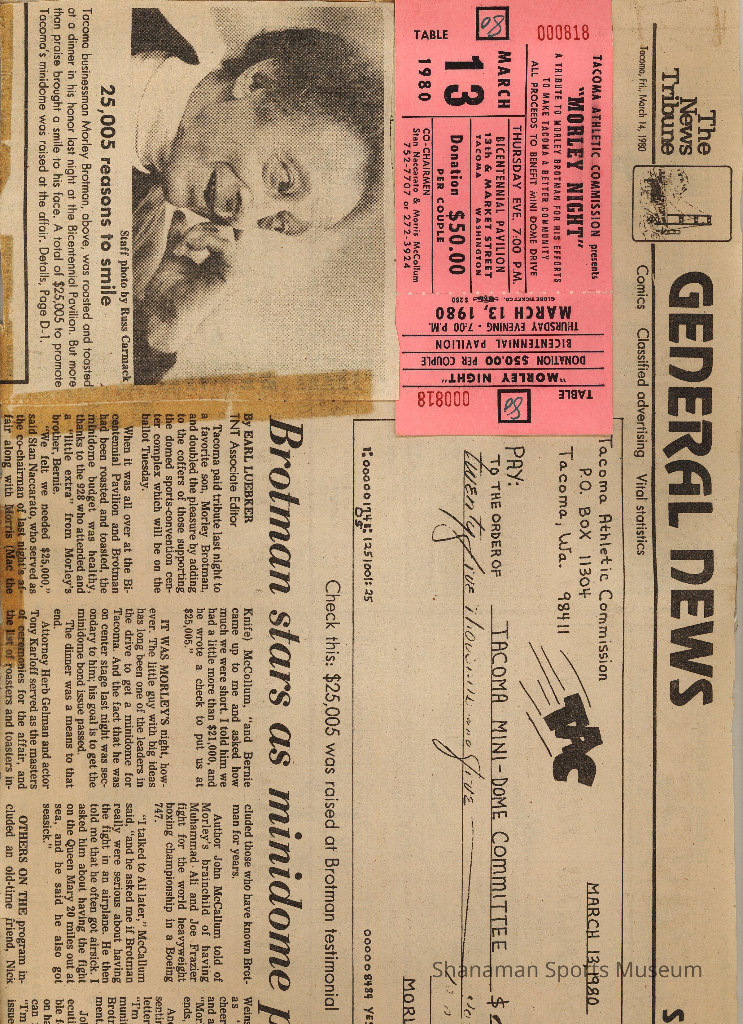 Collage of newspaper clippings & tickets regarding the Tacoma Dome project and dinner honoring Morley BrotmanRelationships
