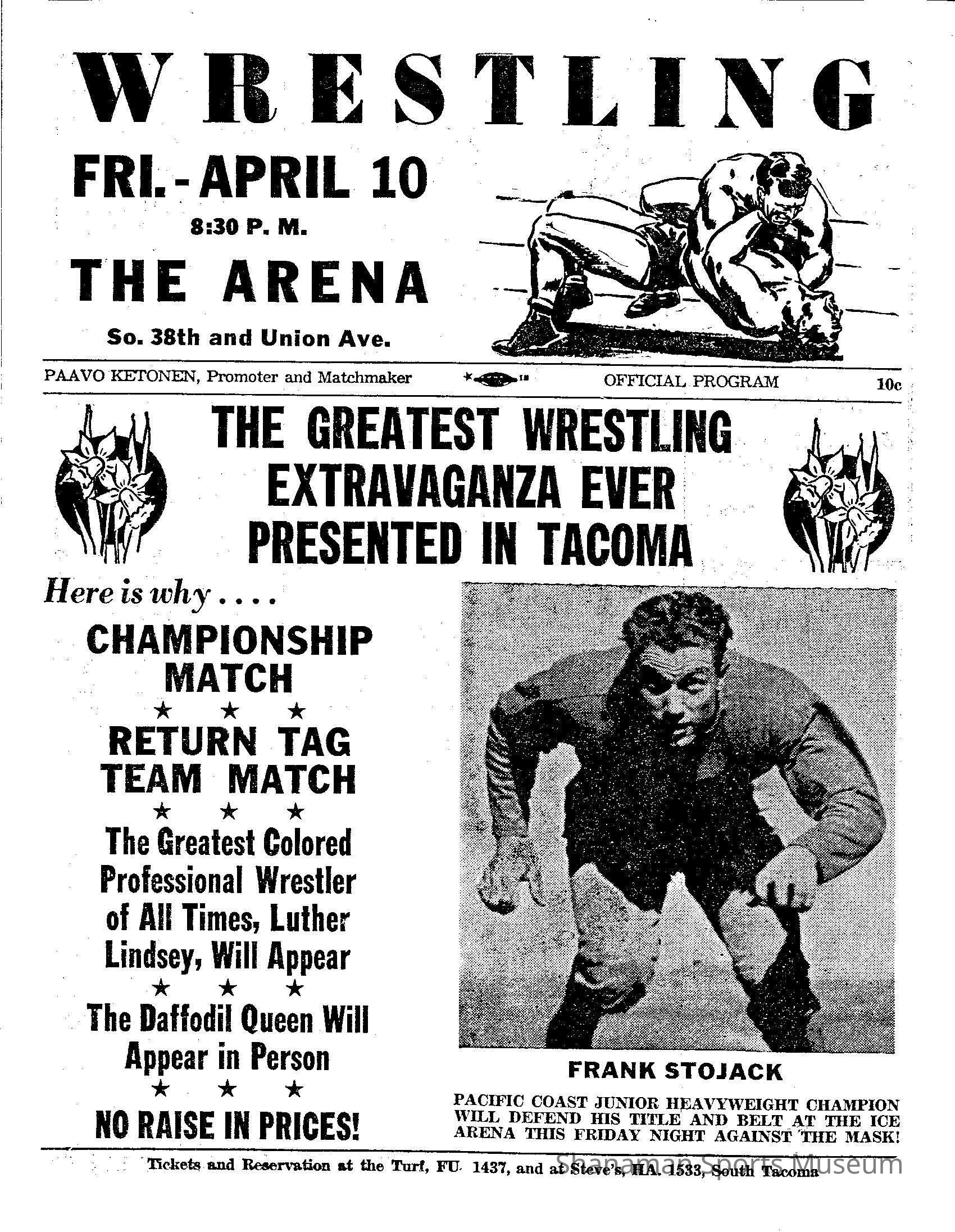 Souvenir program, Wrestling, with a picture of Frank Stojack on cover, April 10, 1952.Lexicon